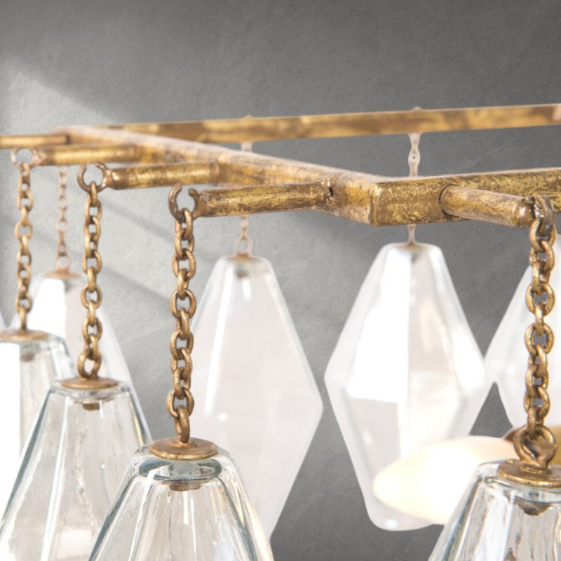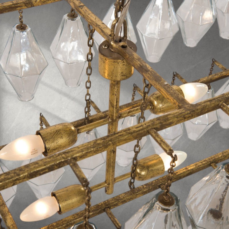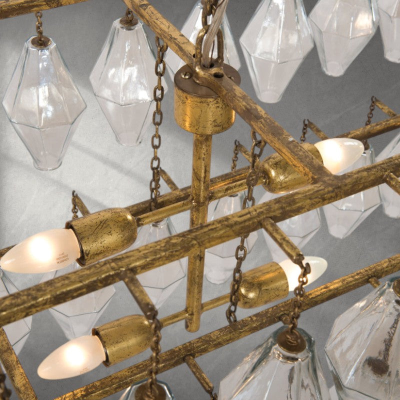 A grandly scaled "waterfall" with slightly industrial details takes glamour in a new direction. Hand-finished and iridescent glass makes a stunning statement.