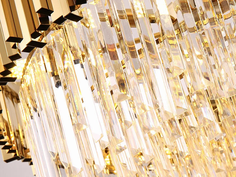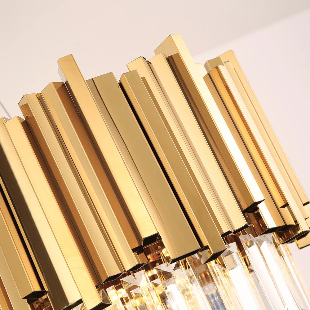A luxurious large rectangle chandelier light for the diningrooms, kitchens, or restaurants.. gracefully exudes an auraof timeless and sophisticated charm, transforming anykitchen island into a captivating focal point. lts intricateframe is adorned with gleaming golden tubes andsparkling crystals.