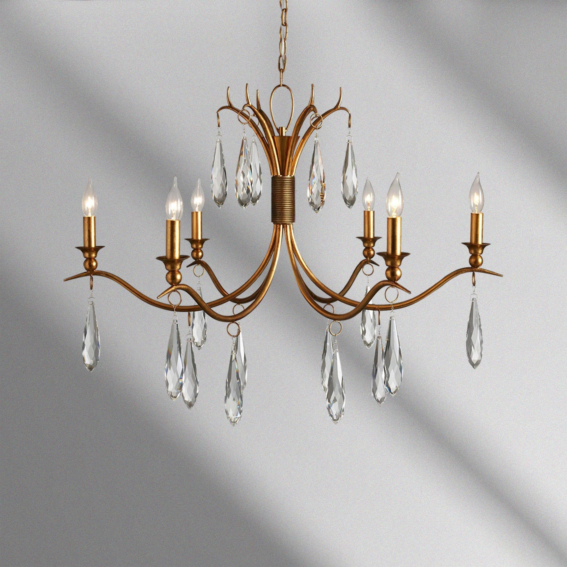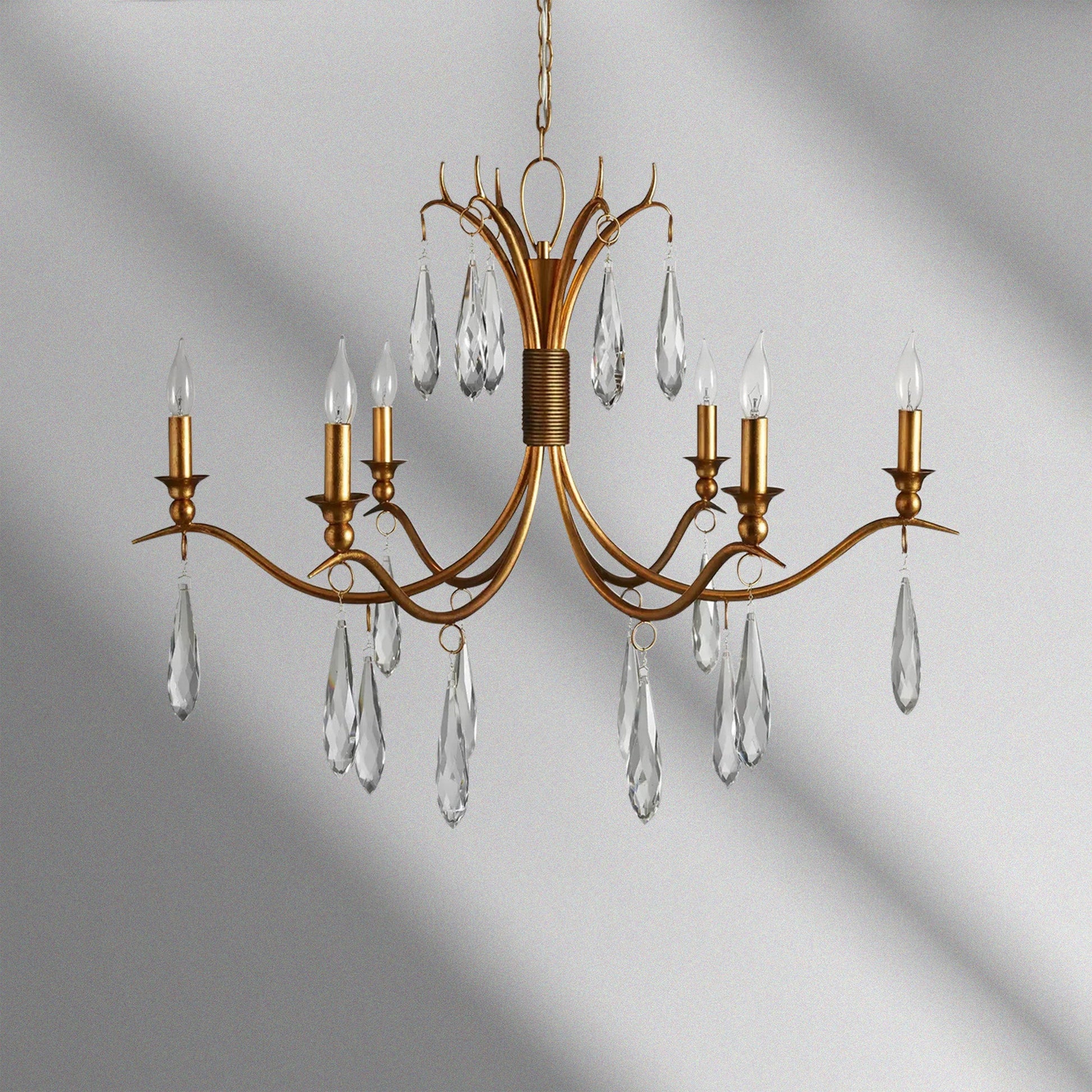 Our stunning Celine Chandelier is adorned with 18 crystal drops that shimmer when illuminated. Its grand scale and warm, gold leaf finish make Celine a focal point in any home.
