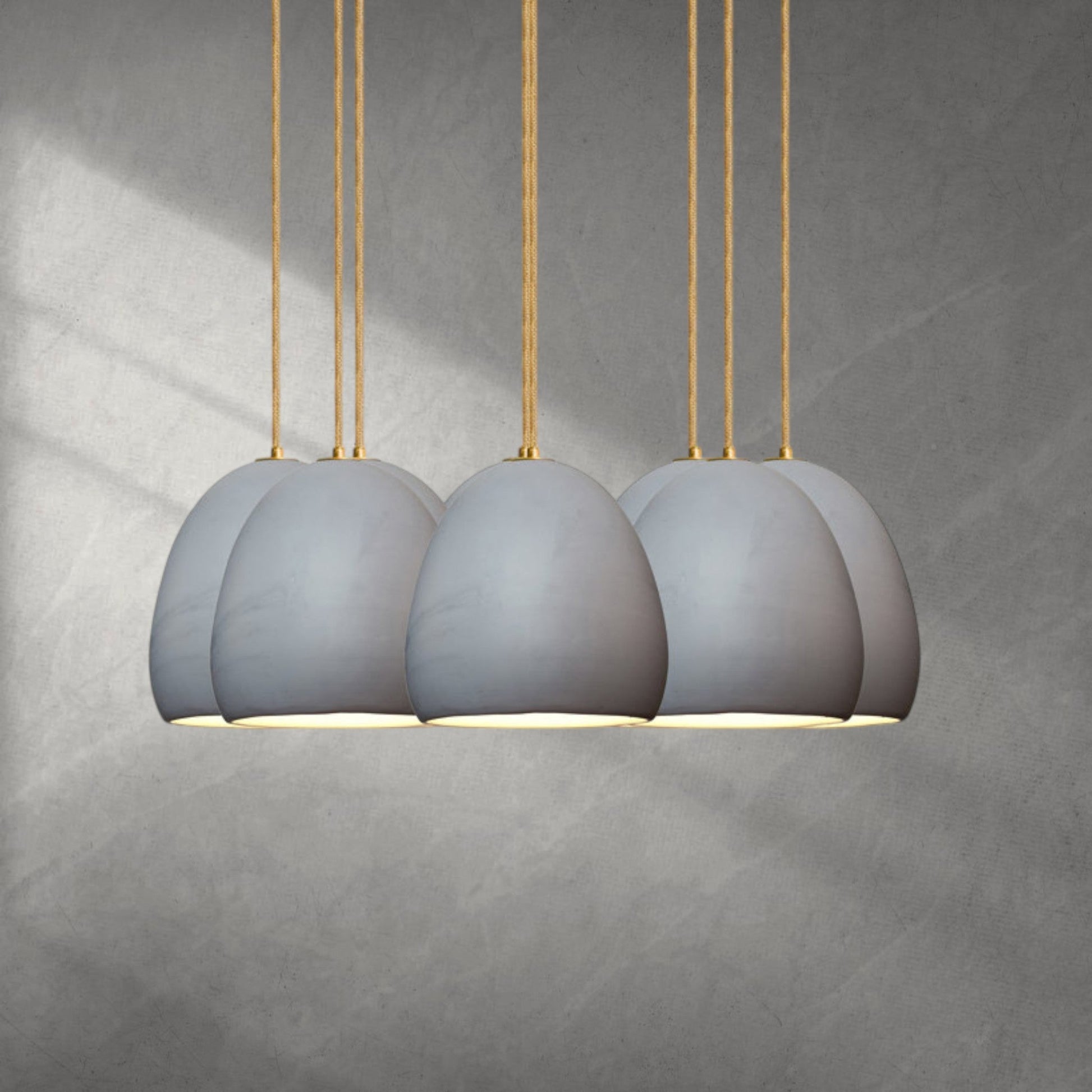 Each pendant of this trio is hung so they cascade down organically. Made of clustered matte Gray porcelain pendants and modern braided nickel cord this chandelier is absolutely unique. We make our own porcelain and hand-dye the Gray color to ensure perfection. Each ceramic pendant fixture is hand made in the USA. Light from porcelain pendants cast cleanly and wide, just like any other light due to the placement of the socket.