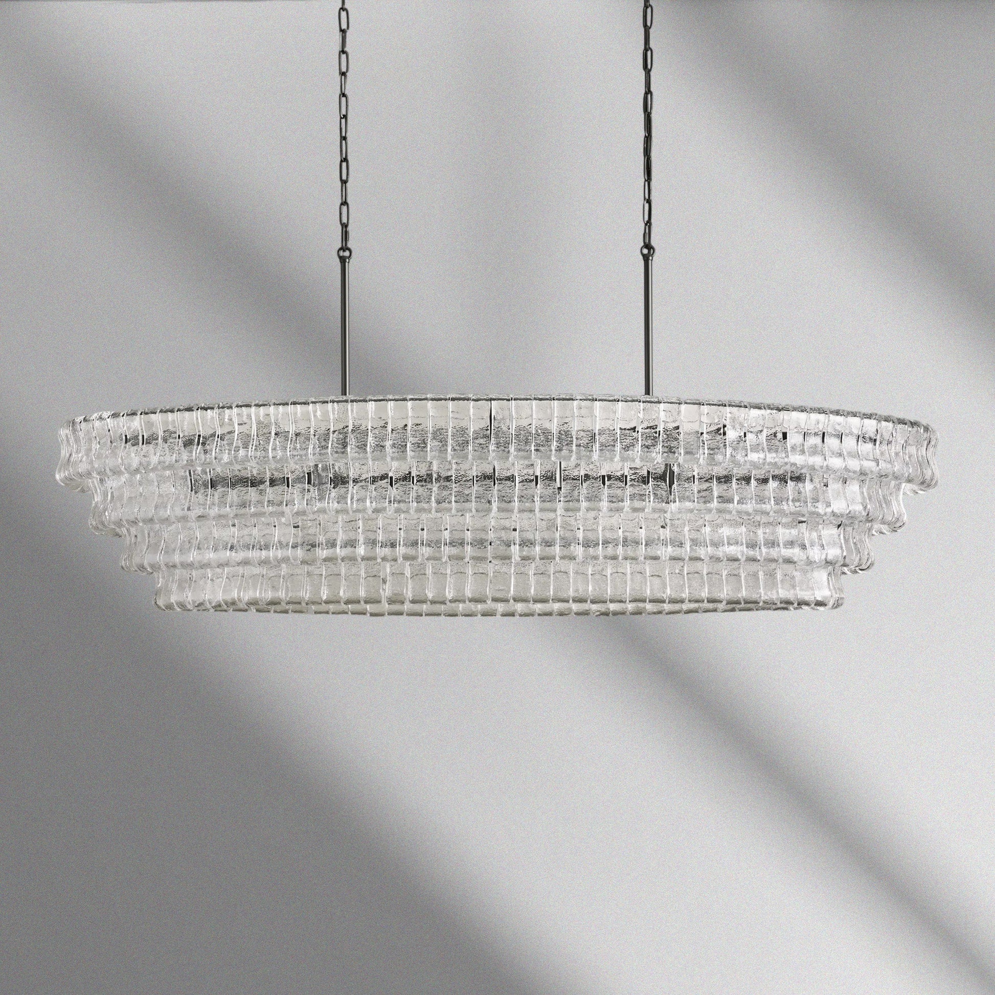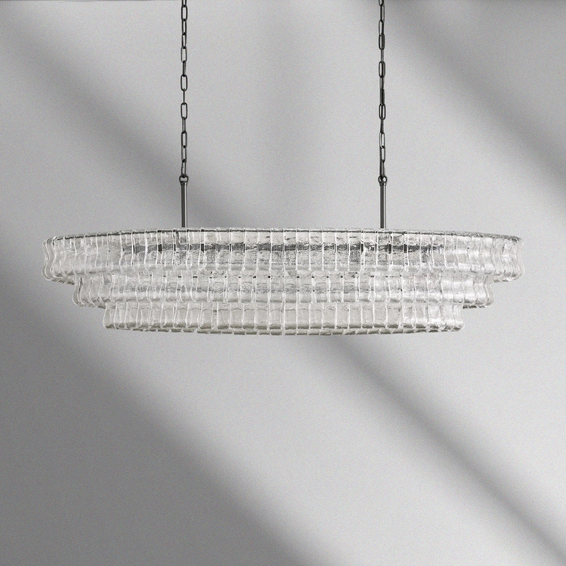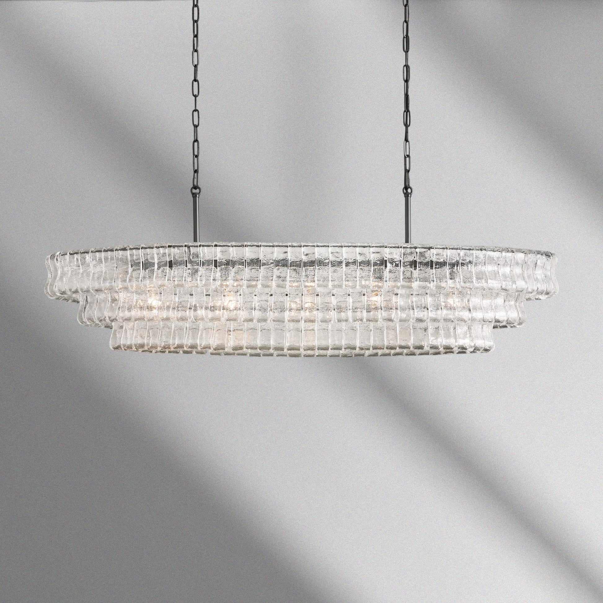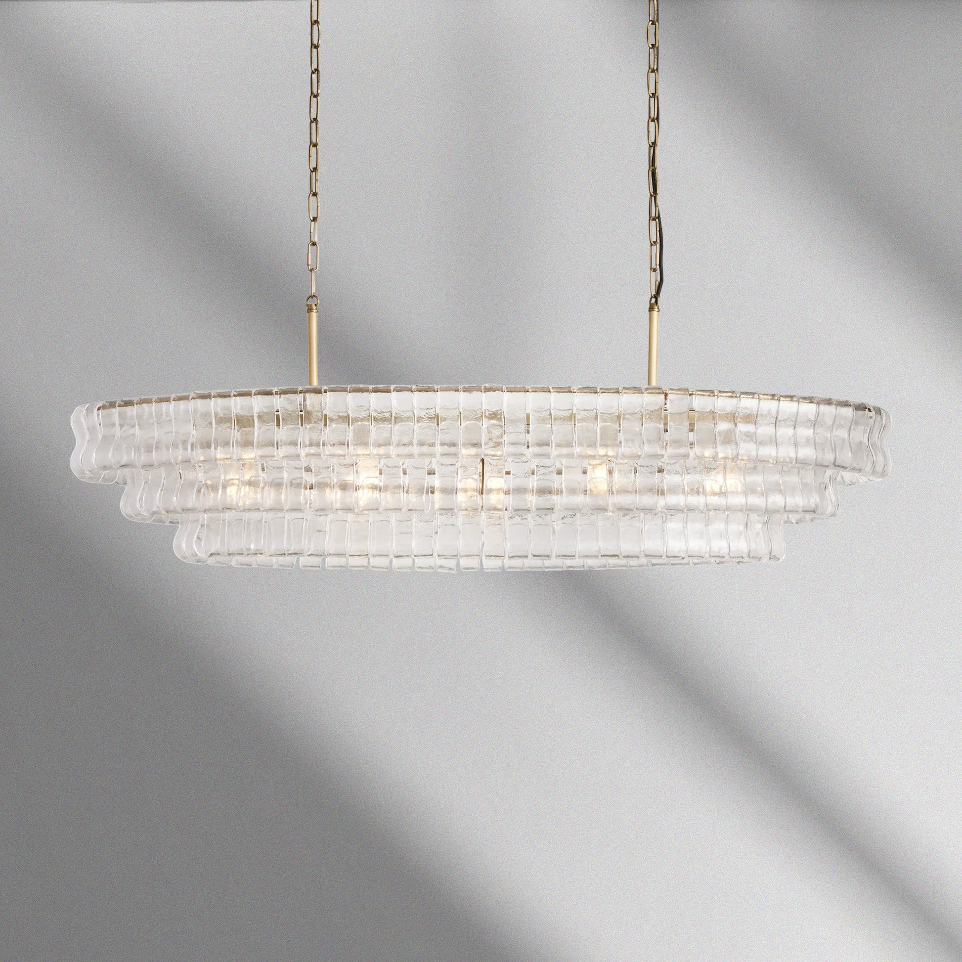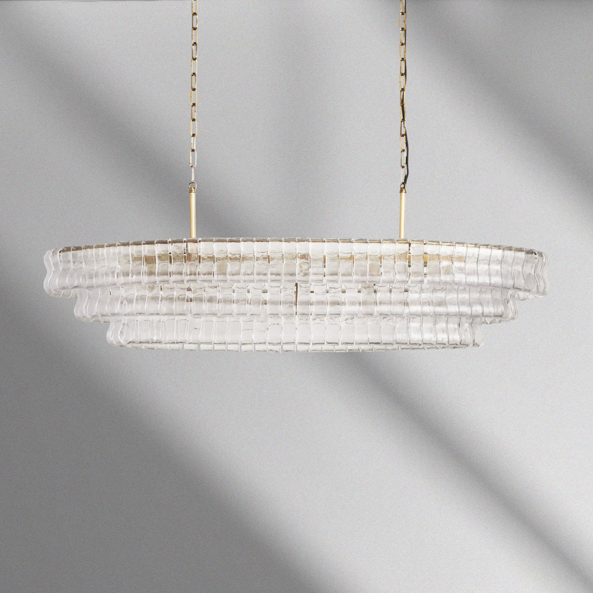 nspired by famously adorned Italian glass, our Ghiaccio Chandelier artfully diffuses light through pieces of curved, textured glass. Complemented by a plated-brass finish, Ghiaccio elegantly illuminates any room.