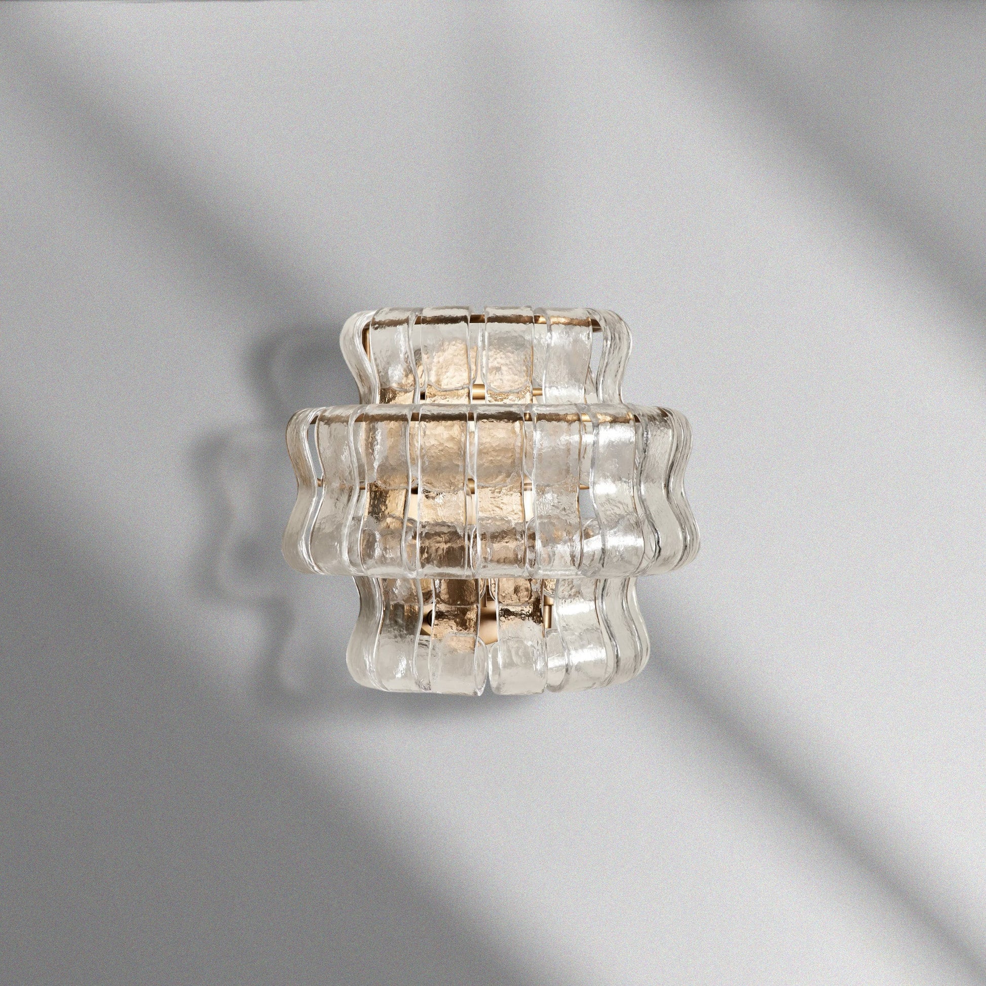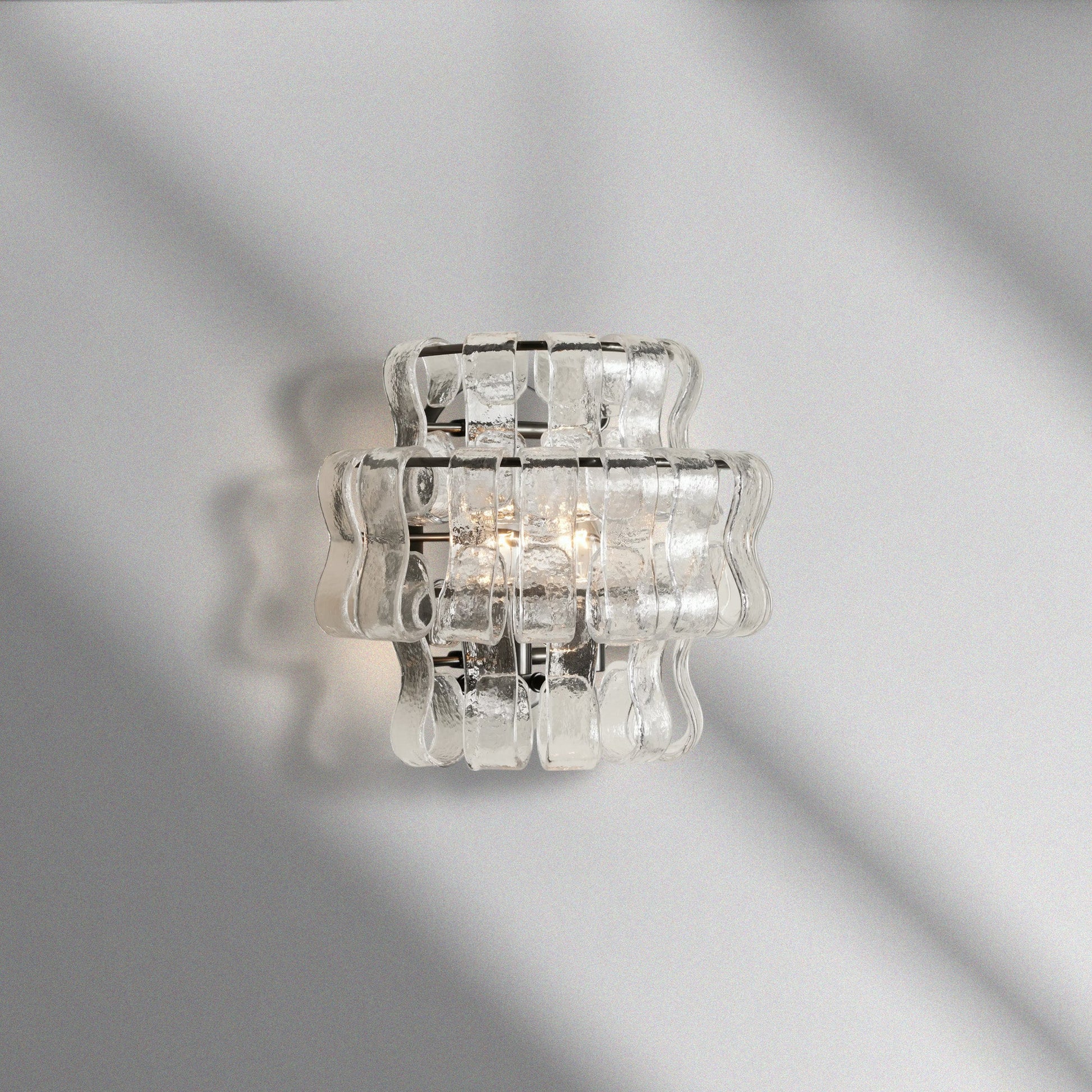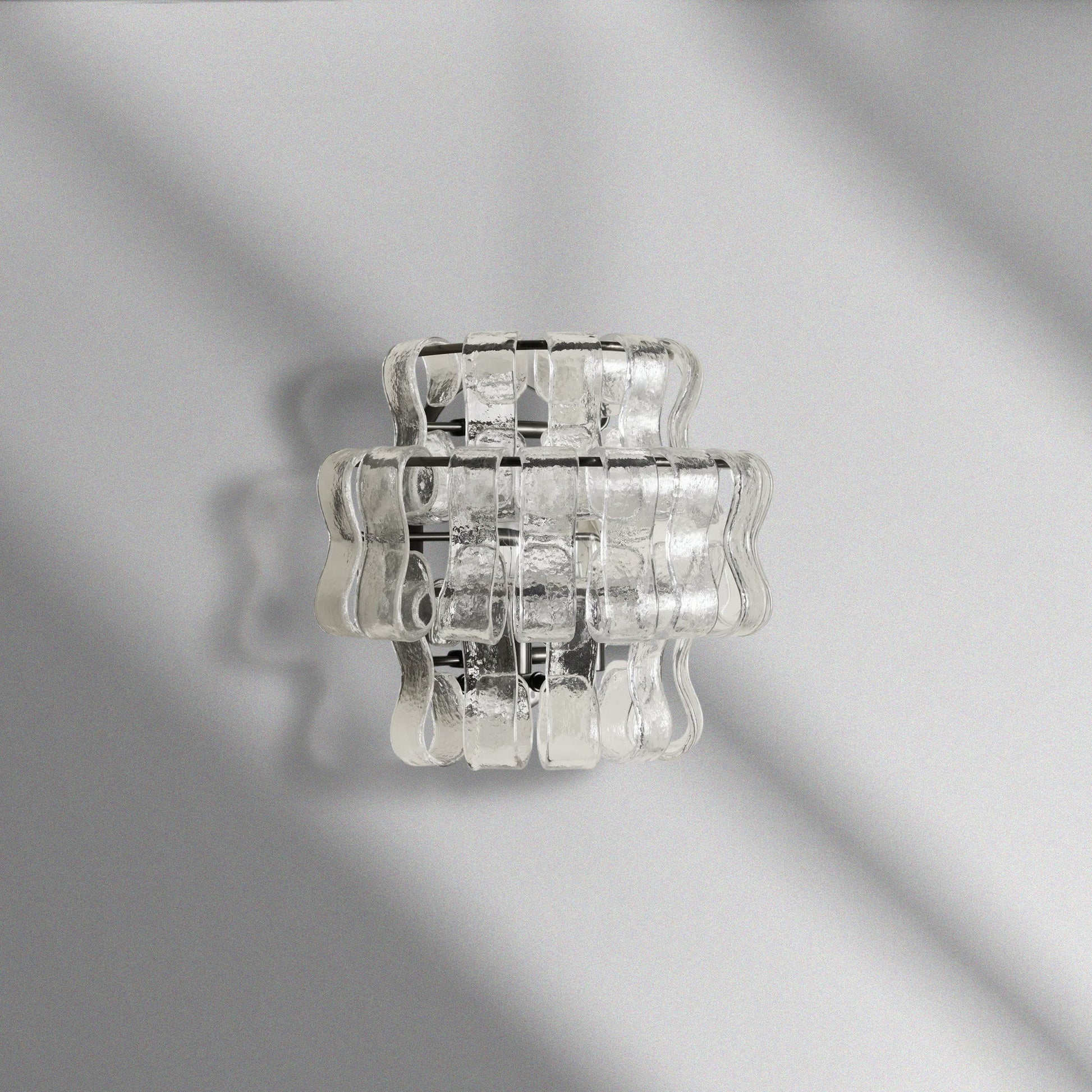 Inspired by famously adorned Italian glass, our Ghiaccio Lighting Collection artfully diffuses light through pieces of curved, textured glass. Complemented by a plated-brass finish, Ghiaccio elegantly illuminates any room.
