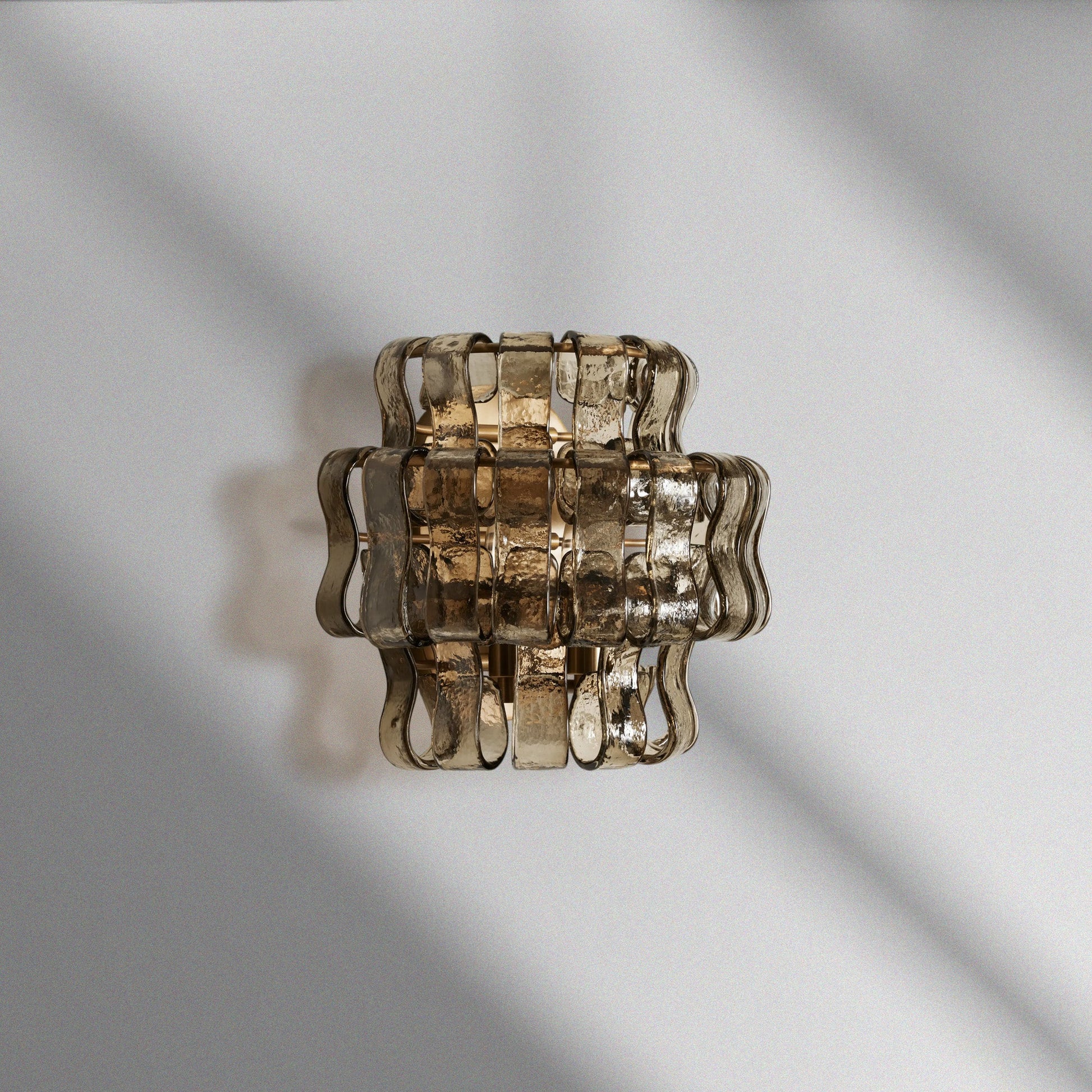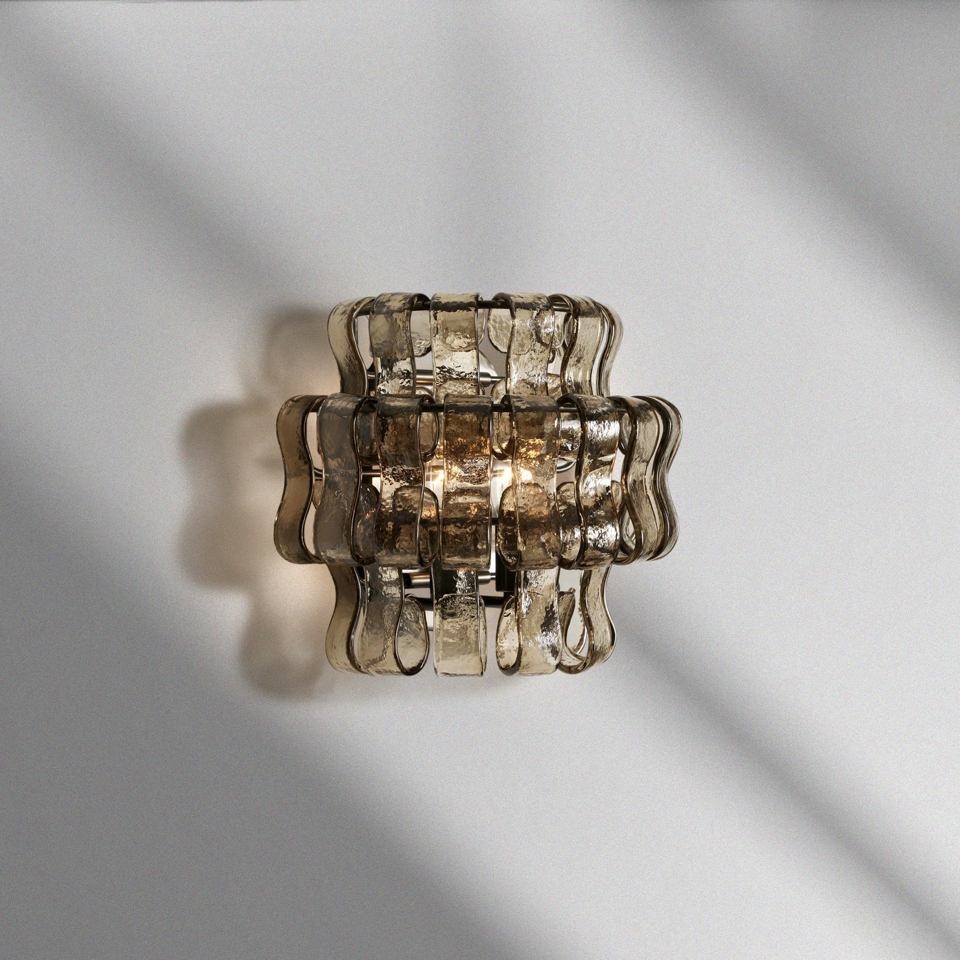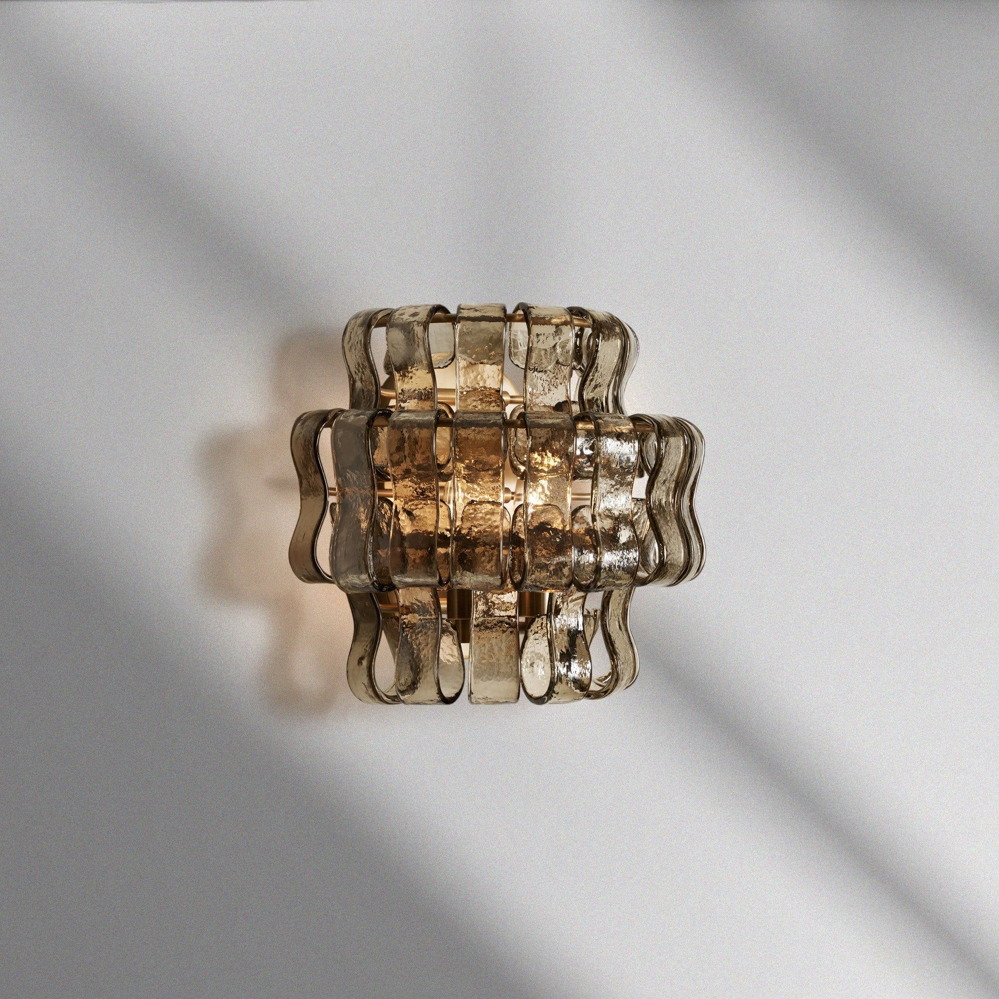 Inspired by famously adorned Italian glass, our Ghiaccio Lighting Collection artfully diffuses light through pieces of curved, textured glass. Complemented by a plated-brass finish, Ghiaccio elegantly illuminates any room.