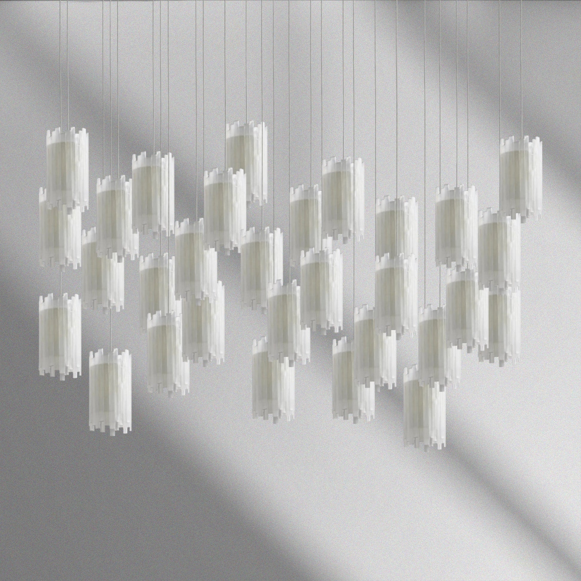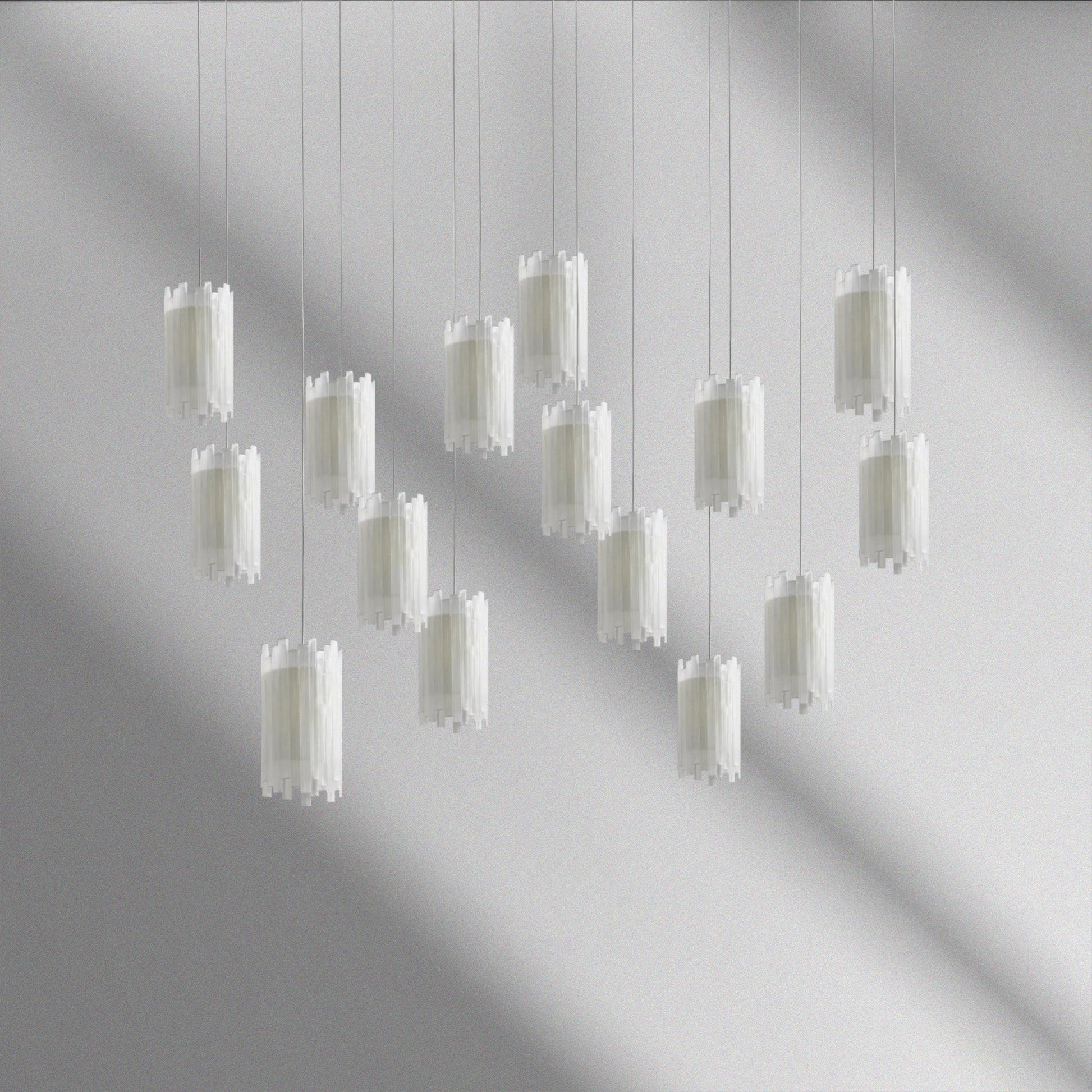 Capture the beauty of falling stars casting a stunning glow in your home with our Gianna Chandelier. Featuring thin, adjustable PVC cables that are customizable to your space, each drop juxtaposes industrial materials with exquisite natural selenite stone shades. When illuminated, the drops appear to be floating in midair—creating a unique and elevated statement in any room.