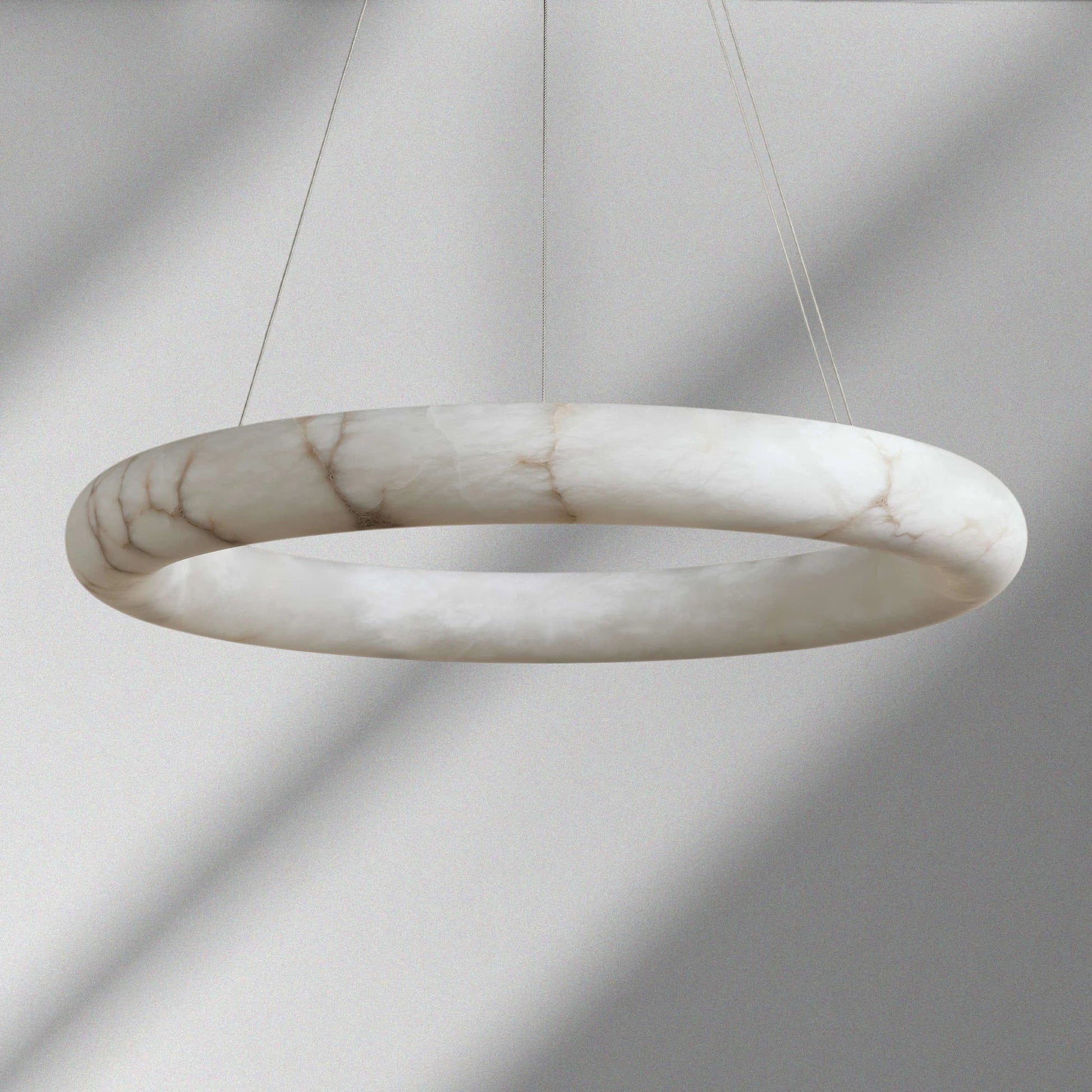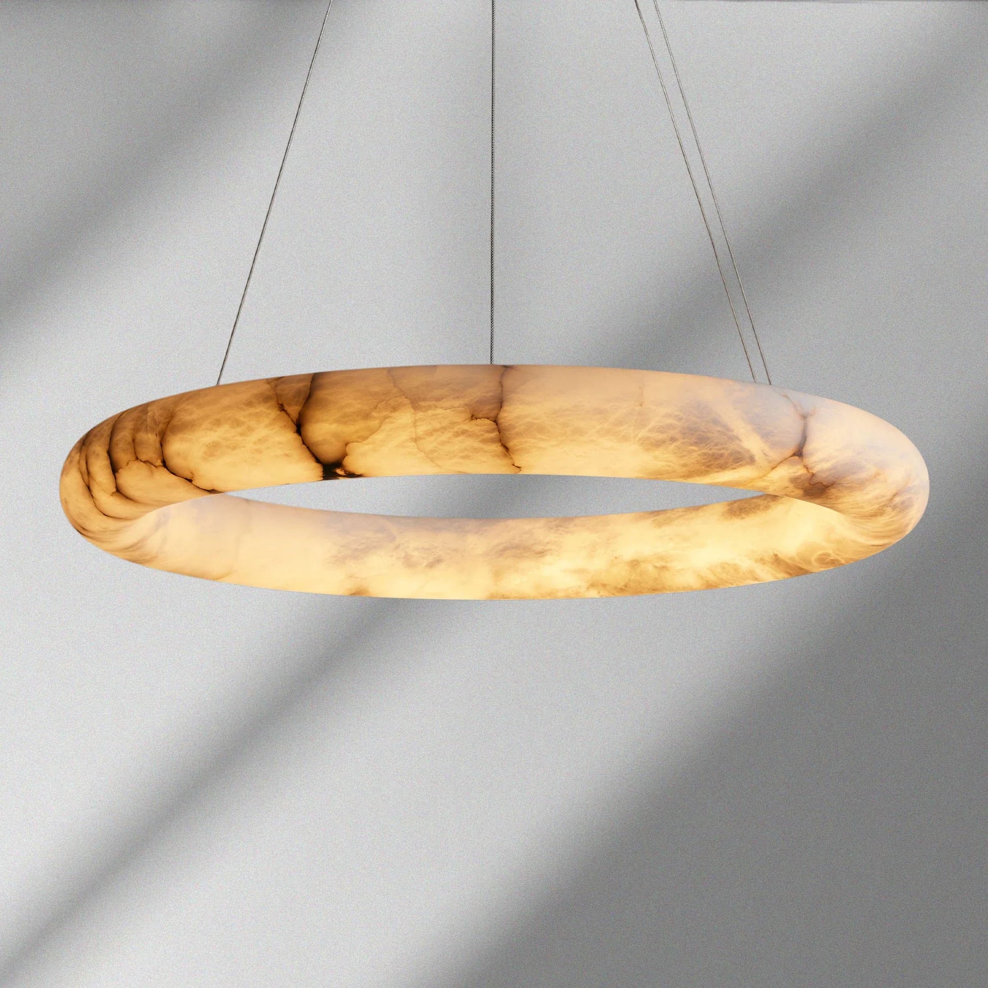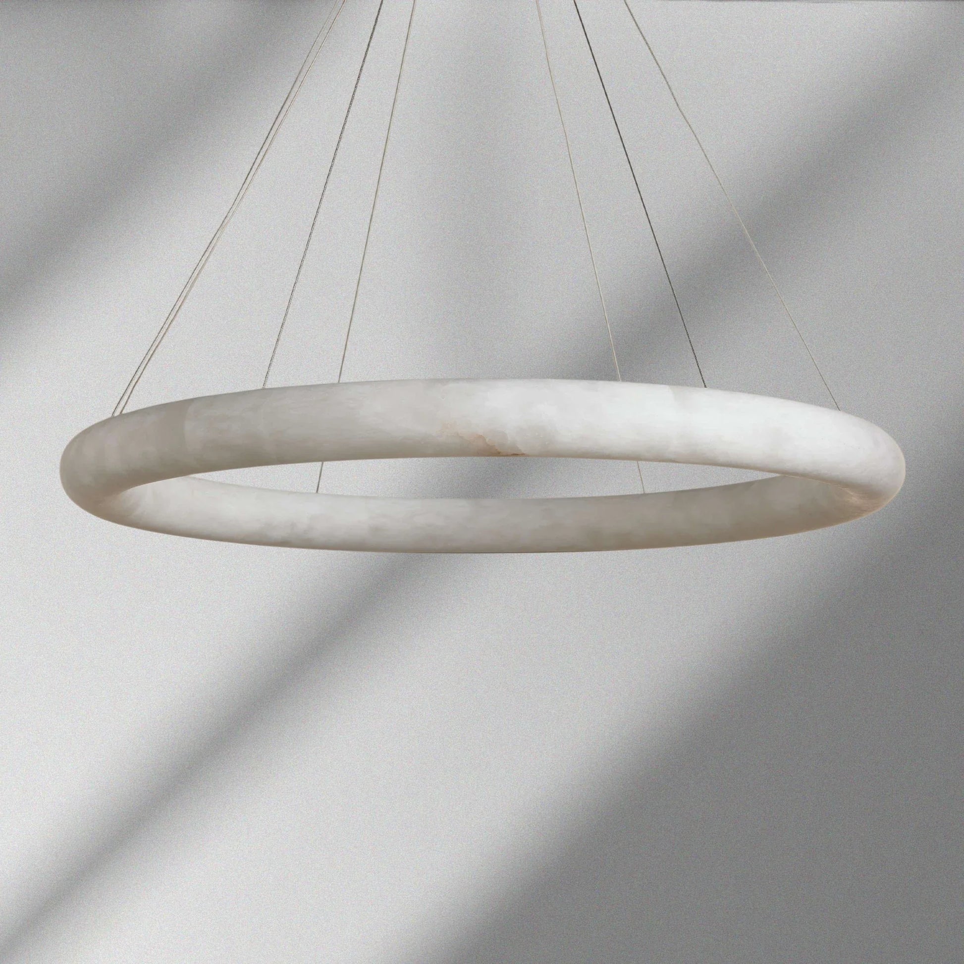 - Crafted from Spanish alabaster stone, steel cables, and brass accents on the canopy.