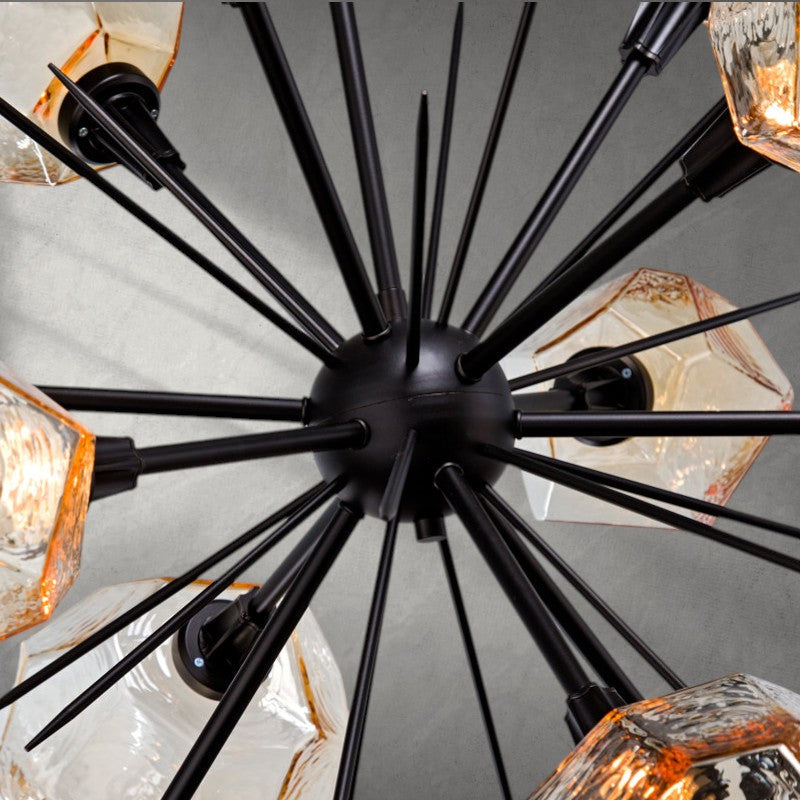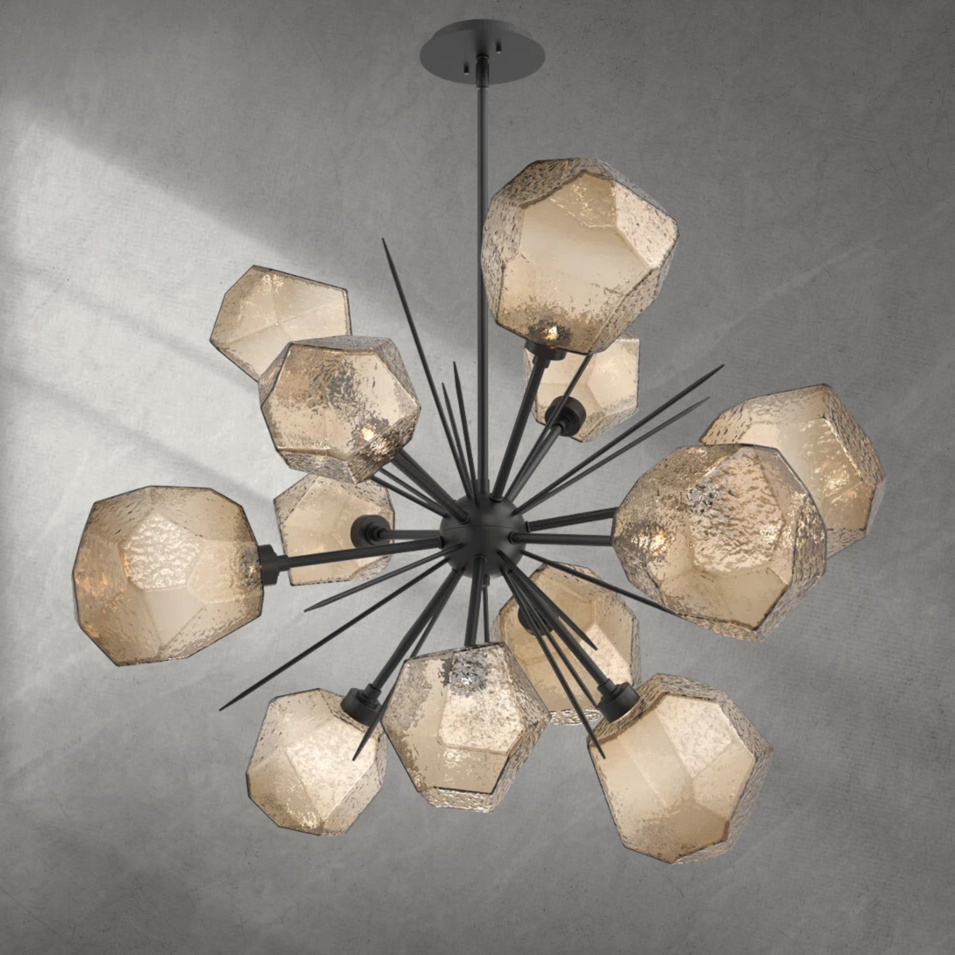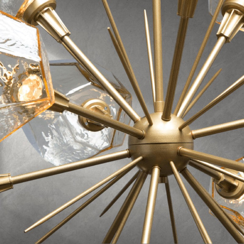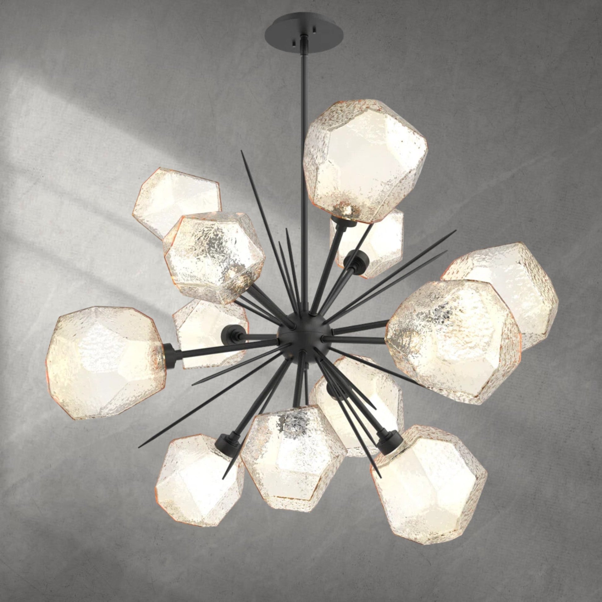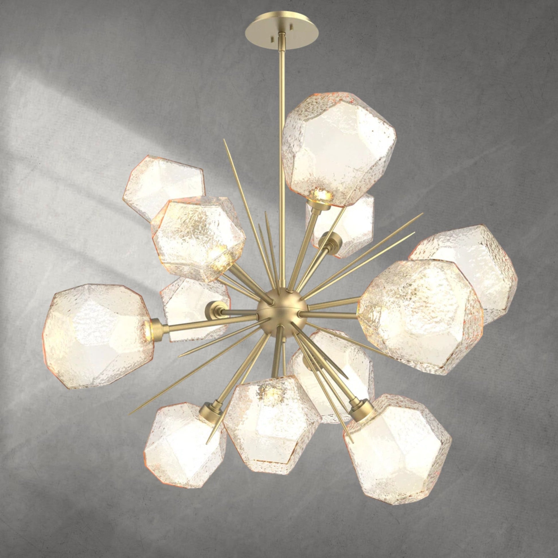 Illuminate your space with this dazzling chandelier, featuring sparkling LED-lit "gems" of hand-blown glass, each meticulously crafted by Hammerton artisans. Its unique starburst design adds a playful yet sophisticated touch, casting a beautiful glow that transforms any room into a wonderland. This dimmable fixture offers adjustable height and is sloped ceiling compatible, making it a versatile and enchanting addition to your home.