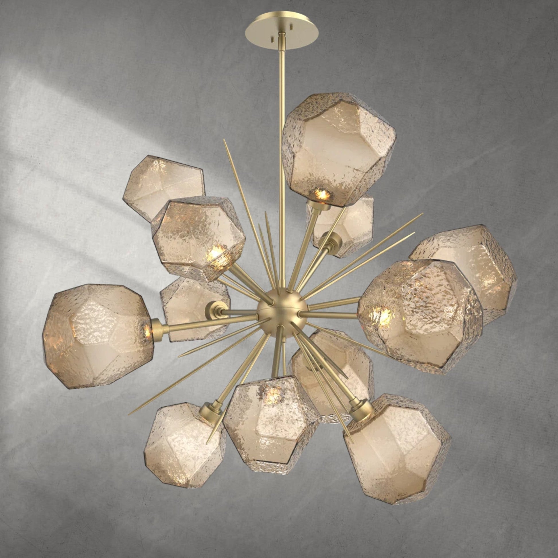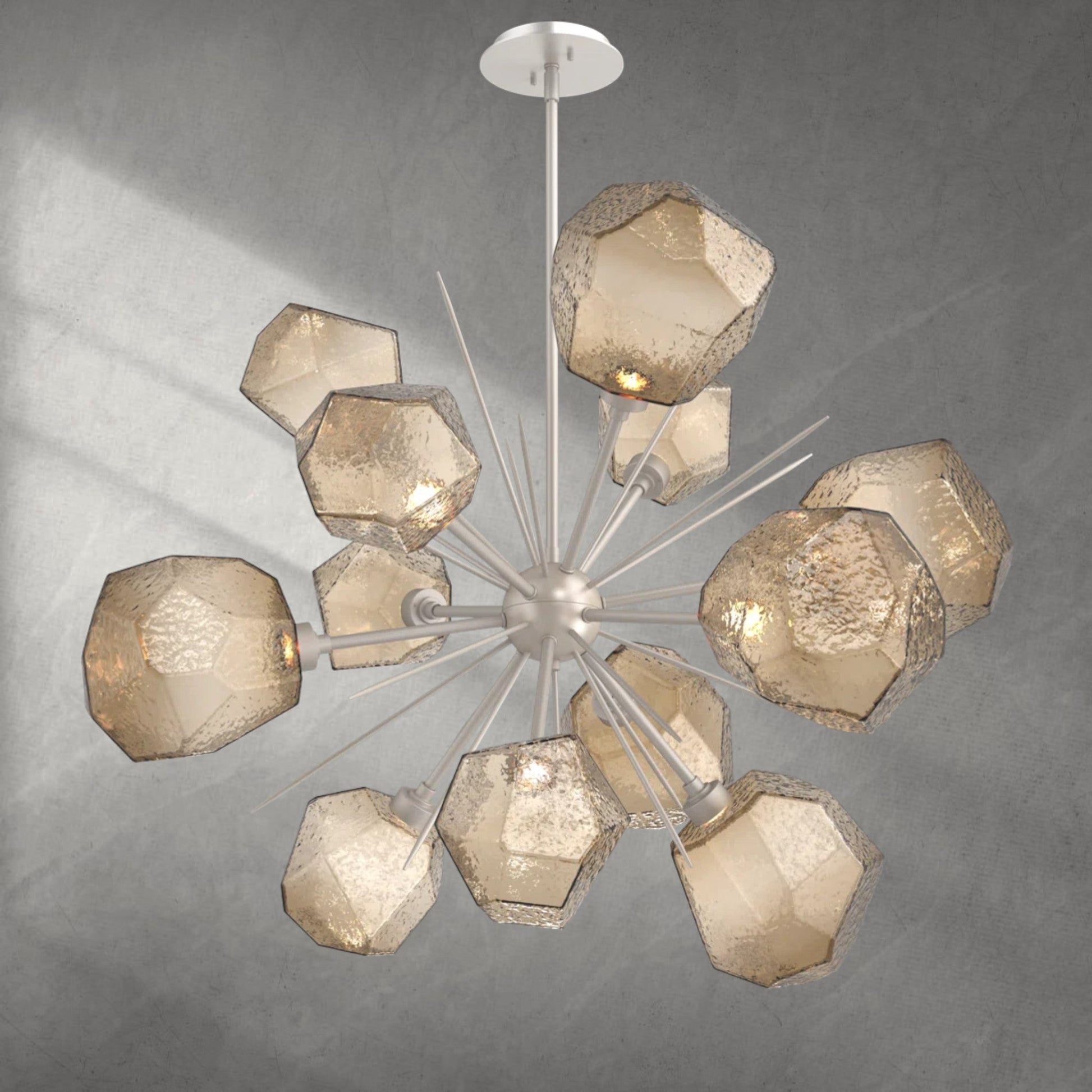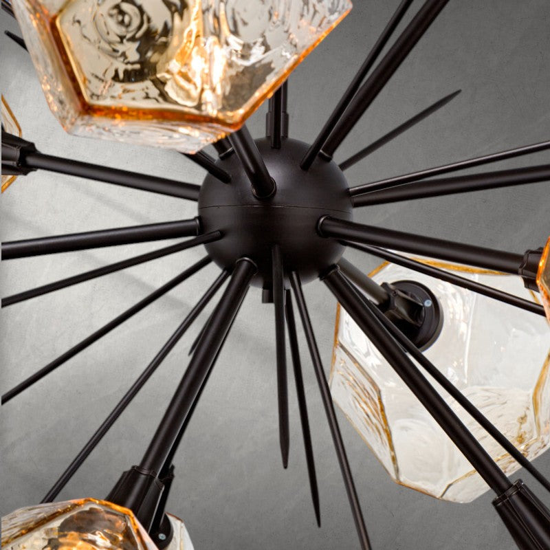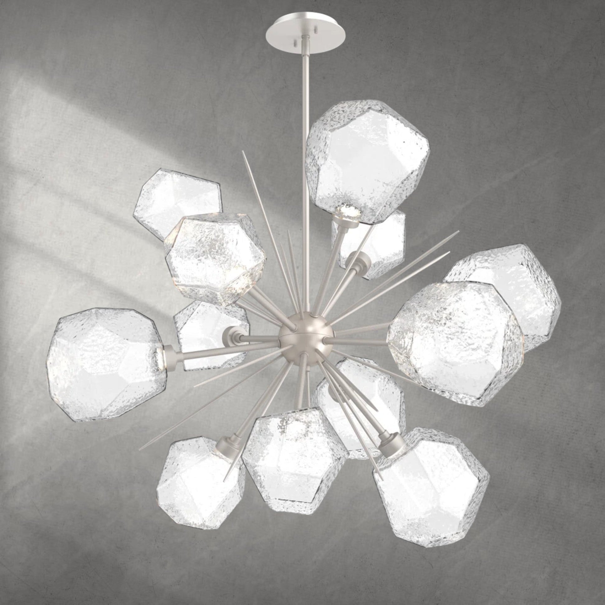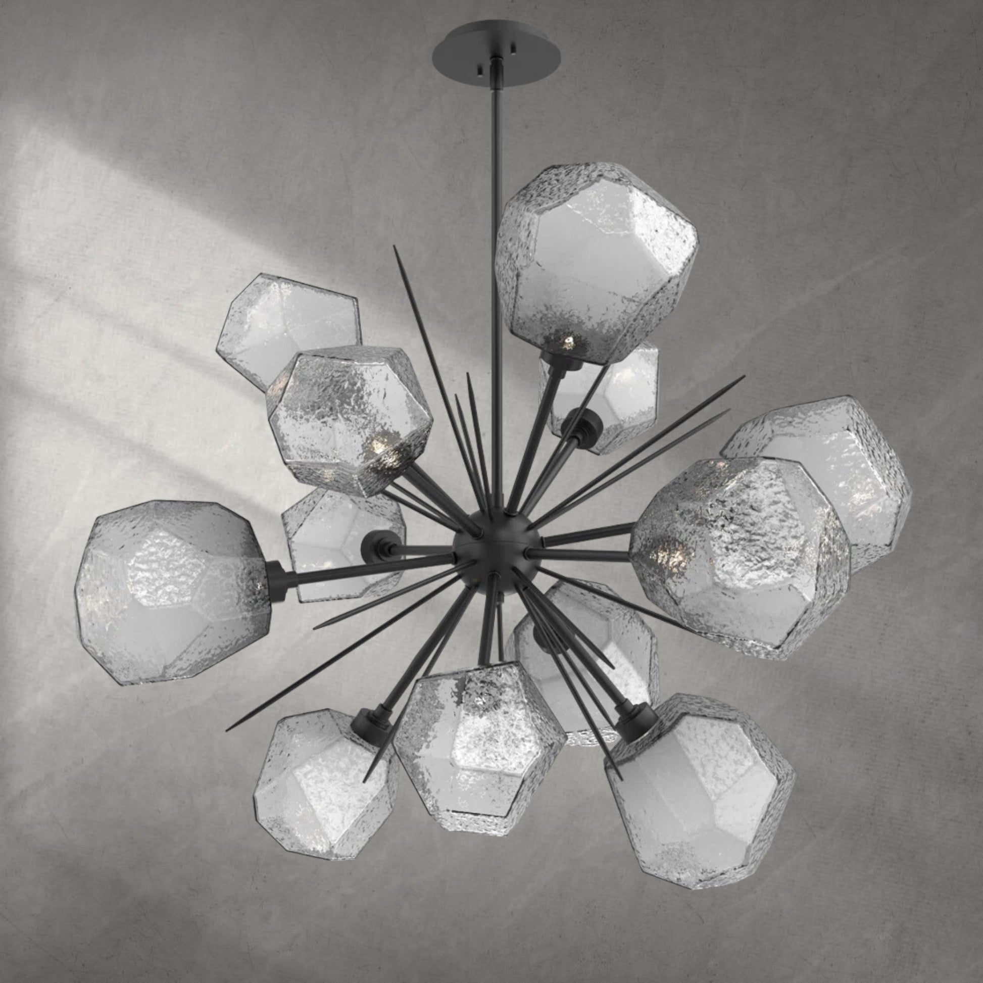Illuminate your space with this dazzling chandelier, featuring sparkling LED-lit "gems" of hand-blown glass, each meticulously crafted by Hammerton artisans. Its unique starburst design adds a playful yet sophisticated touch, casting a beautiful glow that transforms any room into a wonderland. This dimmable fixture offers adjustable height and is sloped ceiling compatible, making it a versatile and enchanting addition to your home.