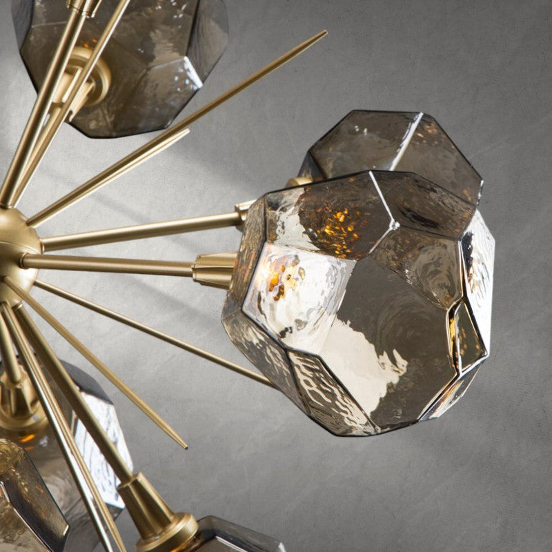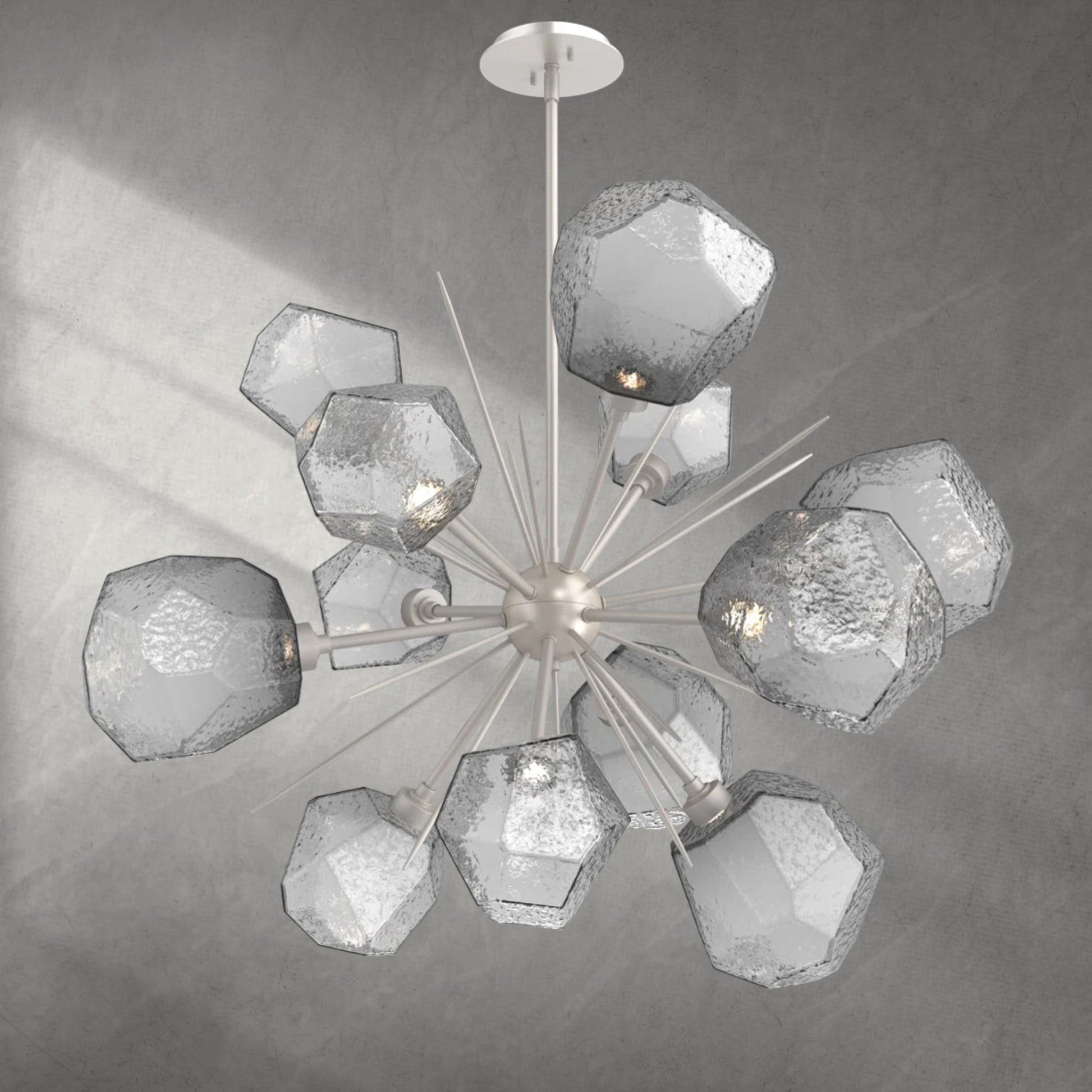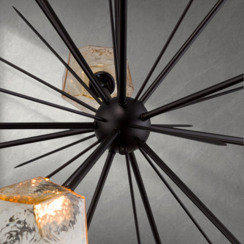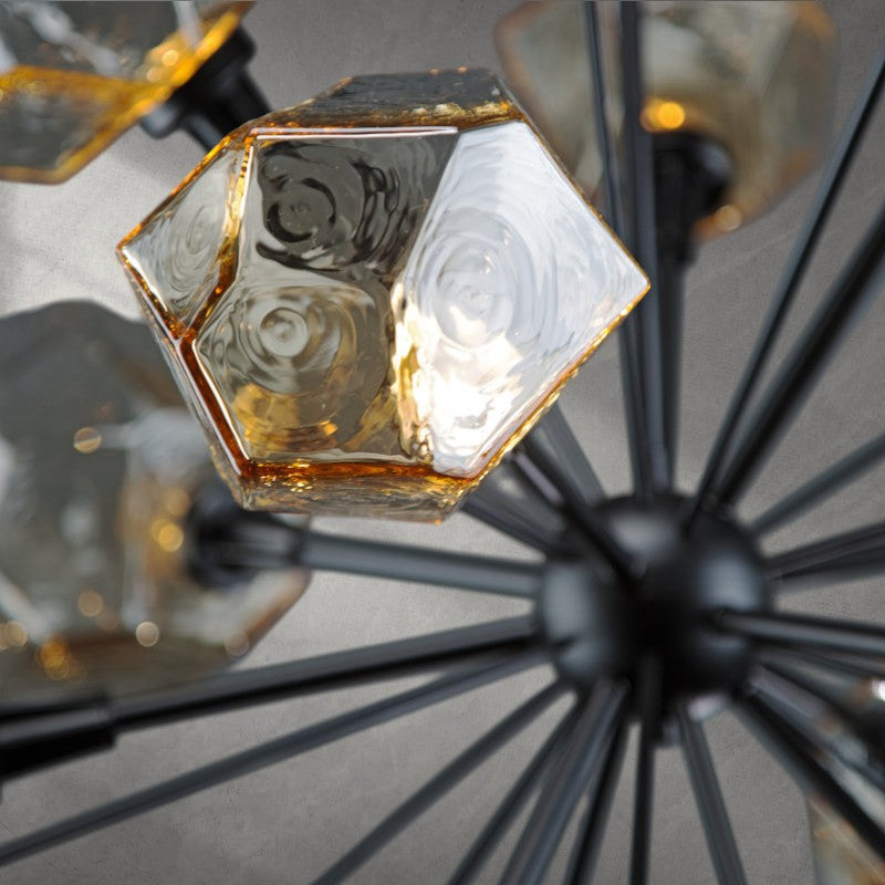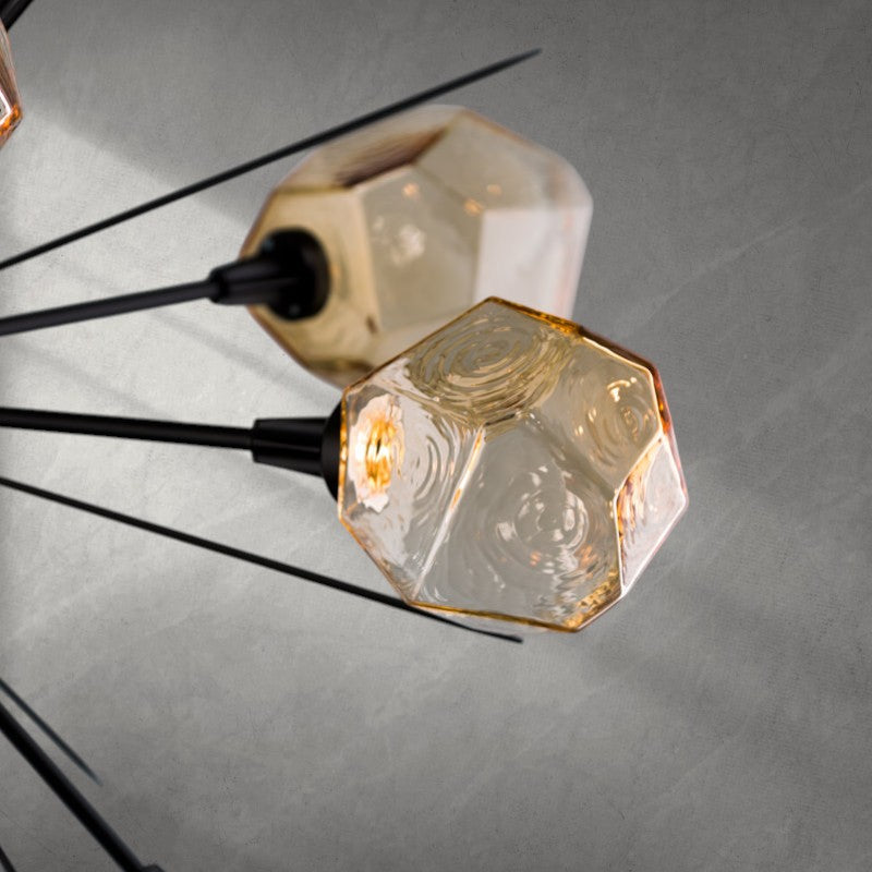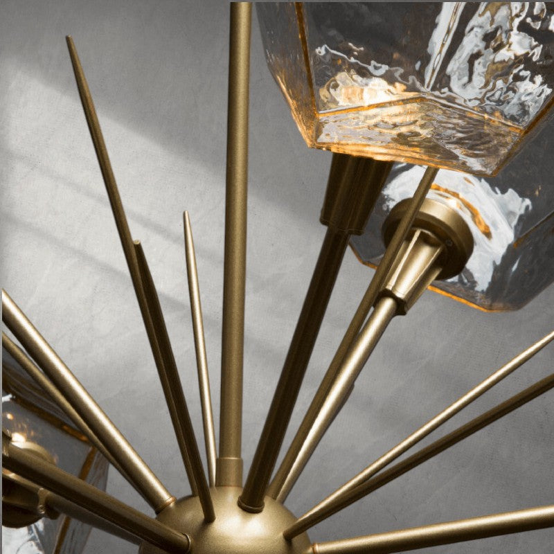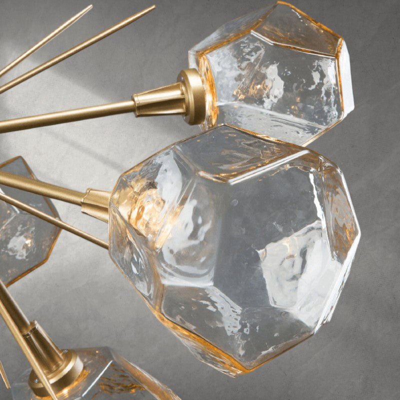 Illuminate your space with this dazzling chandelier, featuring sparkling LED-lit "gems" of hand-blown glass, each meticulously crafted by Hammerton artisans. Its unique starburst design adds a playful yet sophisticated touch, casting a beautiful glow that transforms any room into a wonderland. This dimmable fixture offers adjustable height and is sloped ceiling compatible, making it a versatile and enchanting addition to your home.