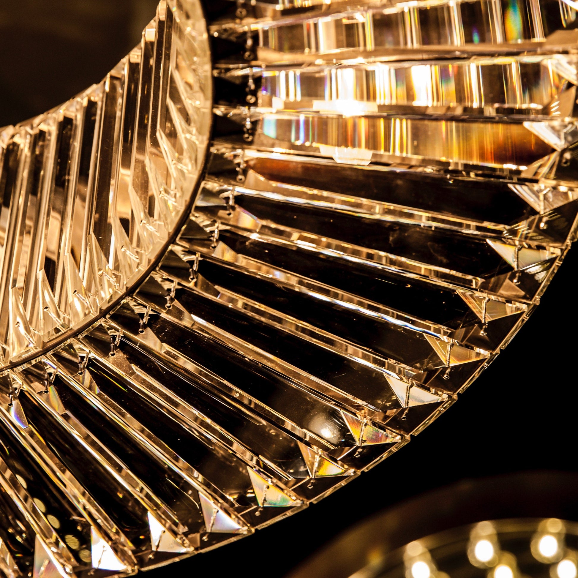 Named after the Roman king, Herod the Great, the Herodes pendant is grandiose in both stature and drama. This spectacular floating halo of sparkle and shimmer is handcrafted from a circular iron frame, covered completely by tightly packed rows of prismatic baguettes. Each prism is made from optical grade glass, clearer and lighter than crystal, theatrically bouncing the light in every direction for show-stopping glamour.