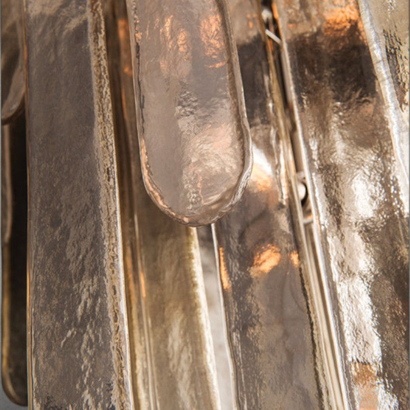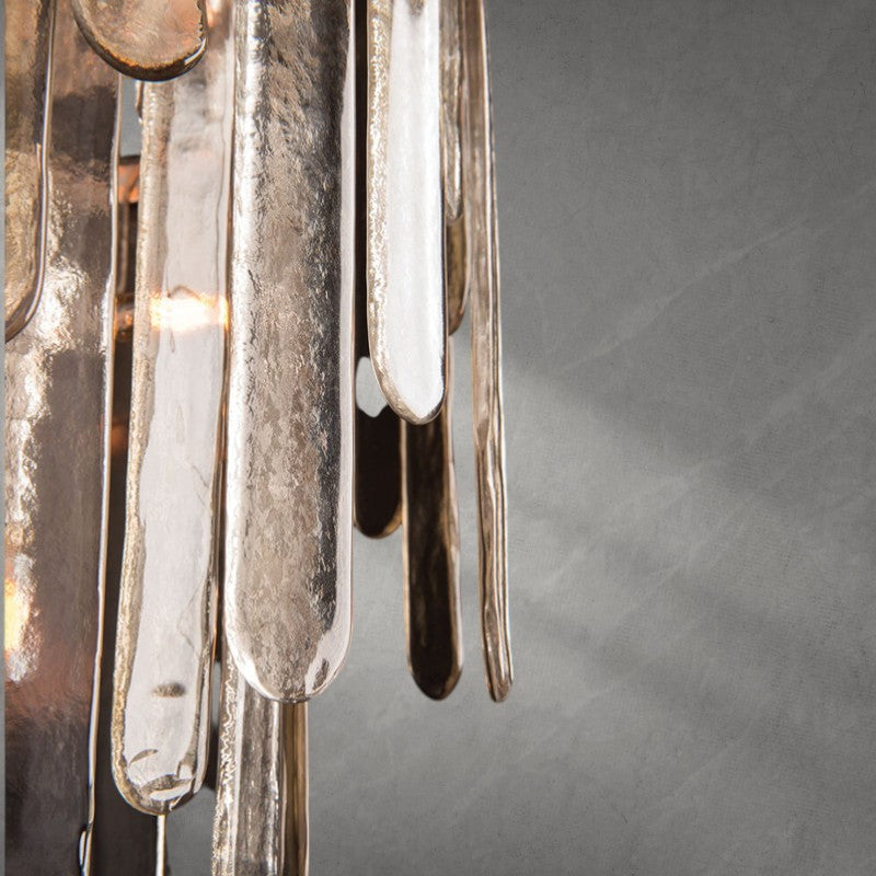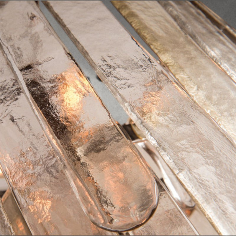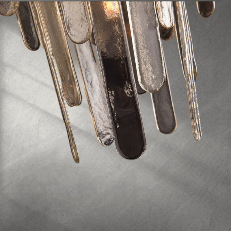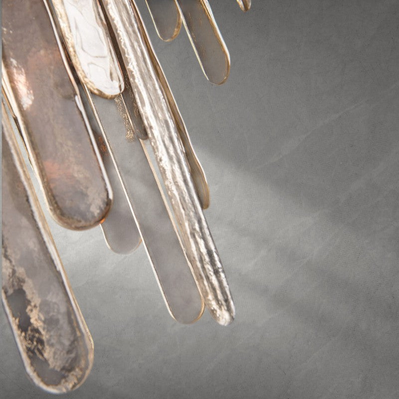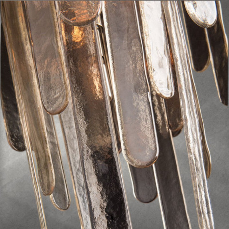 Add a touch of playful elegance to your space with this stunning 16-light cascade pendant. Artisans pour molten glass into molds of three different lengths, creating a unique and antique-inspired look. The rough, champagne-hued glass diffuses light beautifully, casting a warm and inviting glow. This fixture makes a beautiful statement piece in any entryway or living area.