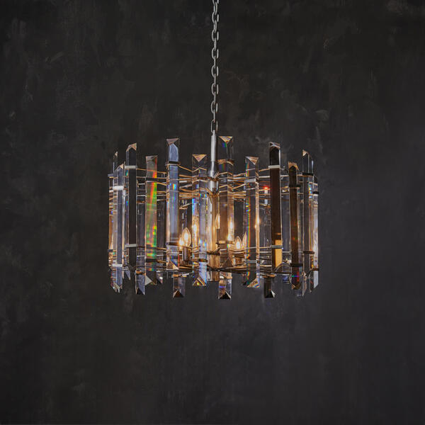 Handcrafted from shimmering prisms of K9 optical glass, the Light Wheel pendant is a unique play on industrial chic. From directly below looking up, the pendant is shaped like a bicycle wheel, with each prism of the wheel held in place by the metal spokes. The triangular prisms have been smoked on one side, making the lightbulb behind it disappear in an optical illusion, creating a series of magical moments where the prisms continue to shine and sparkle of their own accord.