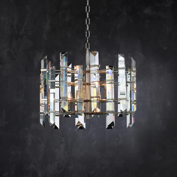 Handcrafted from shimmering prisms of K9 optical glass, the Light Wheel pendant is a unique play on industrial chic. From directly below looking up, the pendant is shaped like a bicycle wheel, with each prism of the wheel held in place by the metal spokes. The triangular prisms have been smoked on one side, making the lightbulb behind it disappear in an optical illusion, creating a series of magical moments where the prisms continue to shine and sparkle of their own accord.