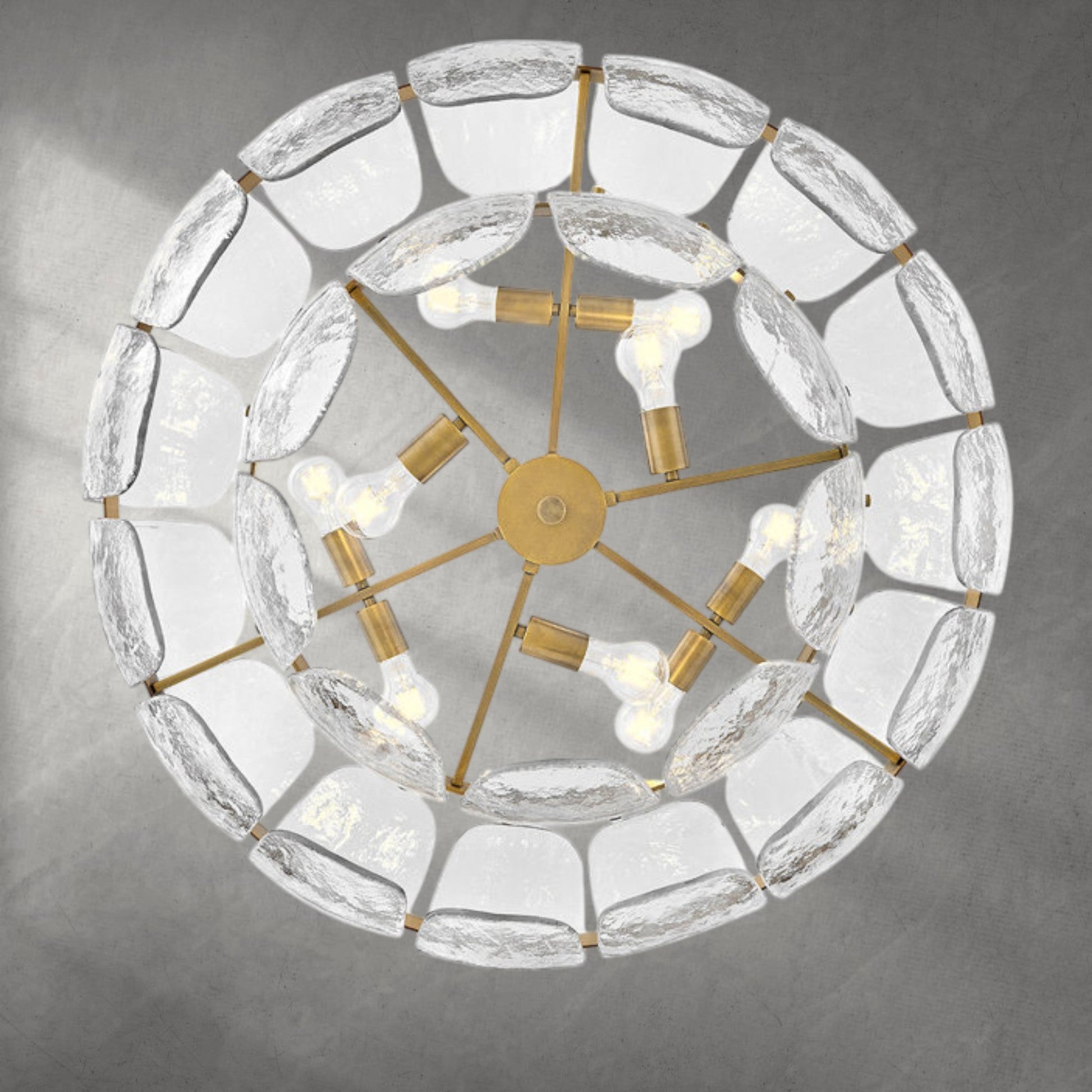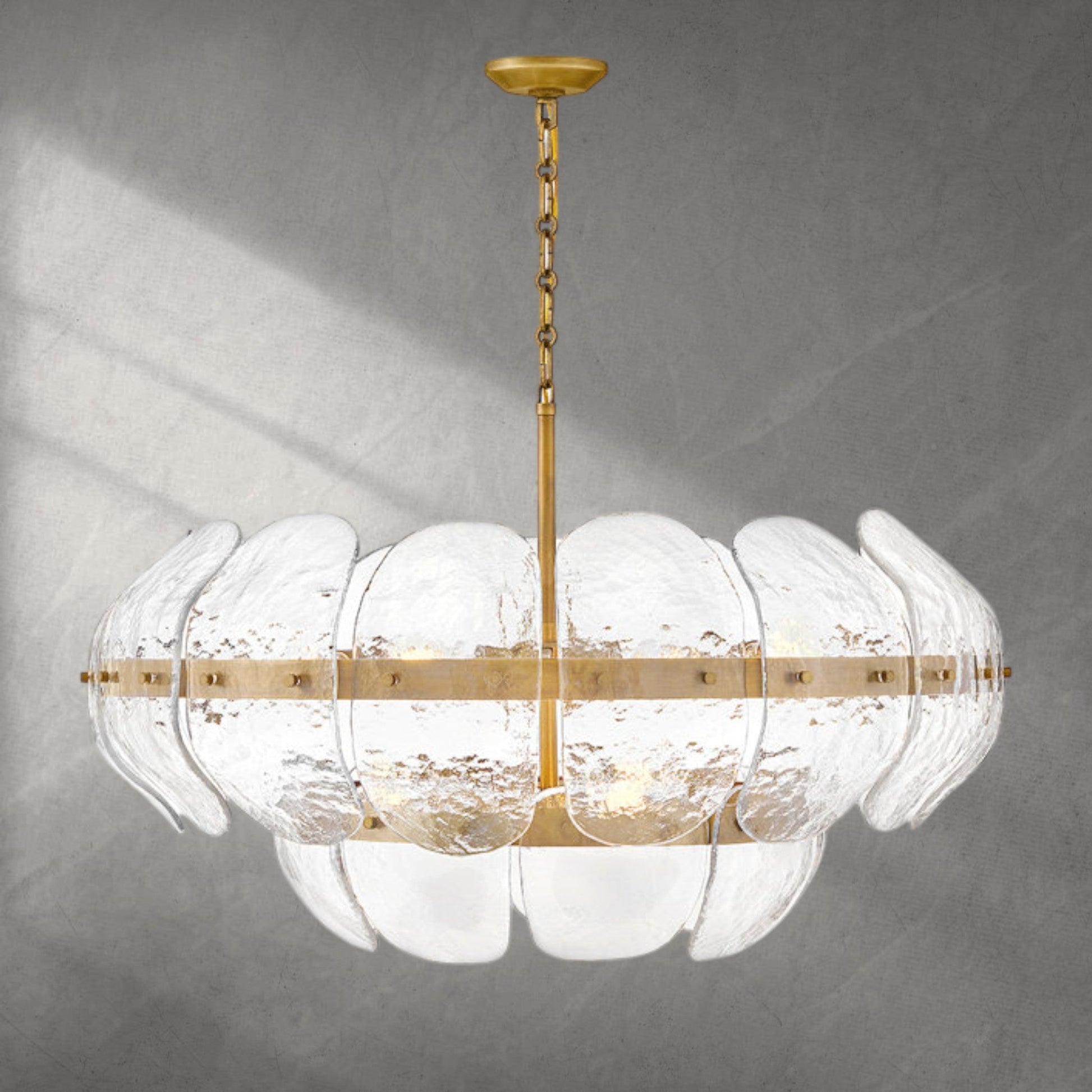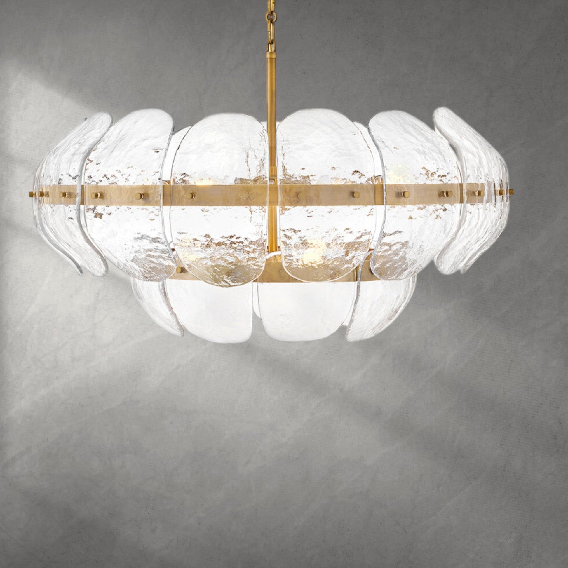 Inspired by the organic elegance of blooming water lilies, Lillia’s large shade is formed from gently curved glass panels. Subtle handcrafted texture creates natural variations in illumination, accentuated by a classic heritage brass finish.