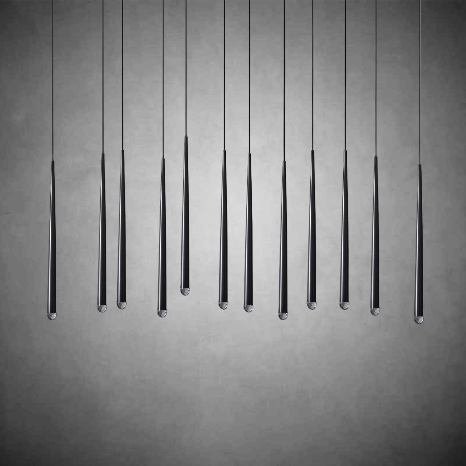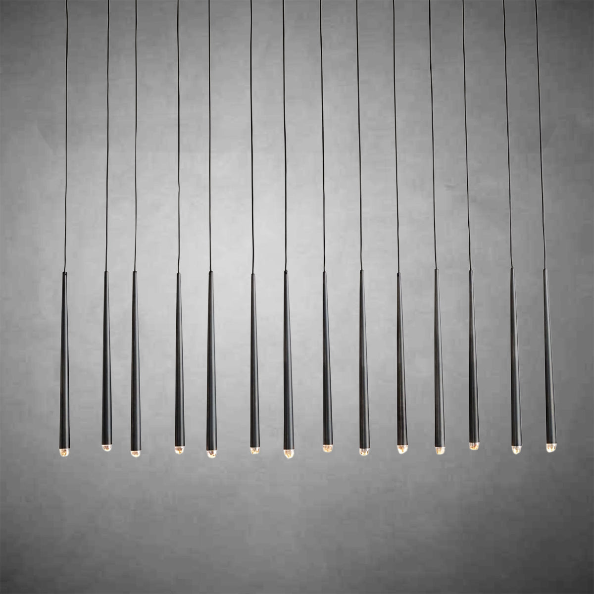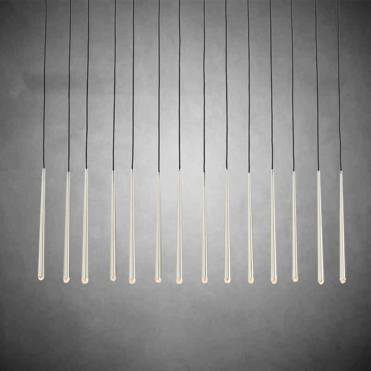 - 14 lights suspended from slender black cords