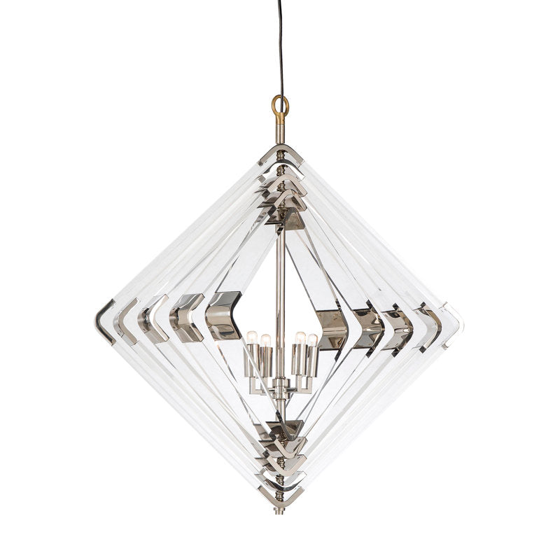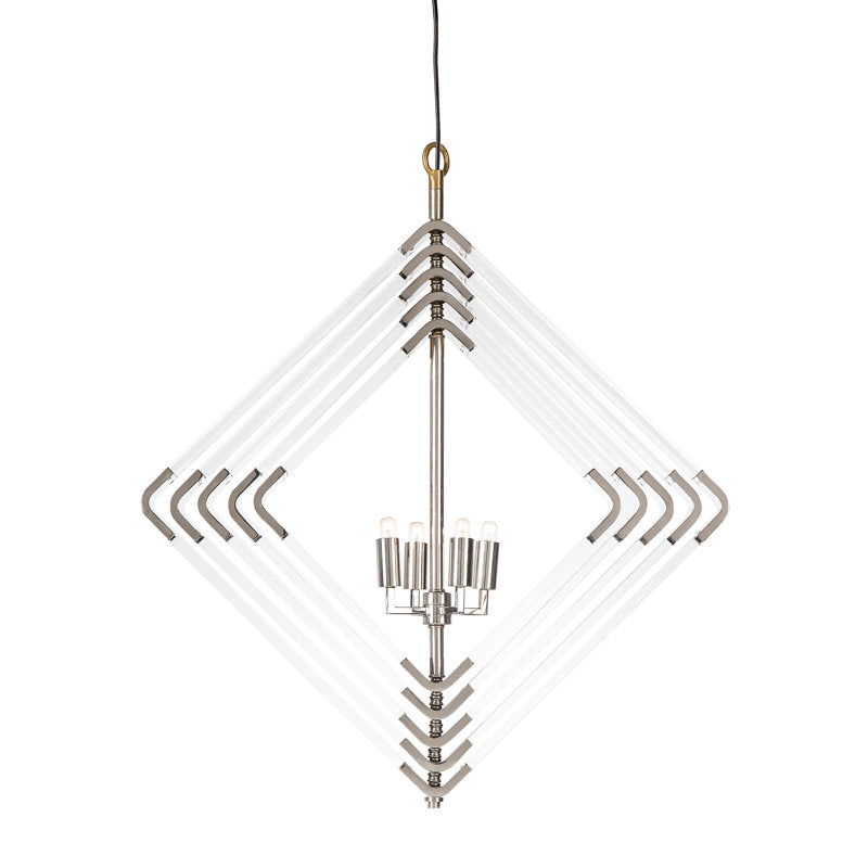 A signature Nellcote Studio piece, this light was created to be a mobile luminaire sculpture for the home. Crafted from a unique combination of polished acrylic and polished nickel, each of the five layers spins independently of the other, allowing for infinite configurations and design possibilities. Four candelabra sockets provide ample light, wrapped in matching solid nickel.