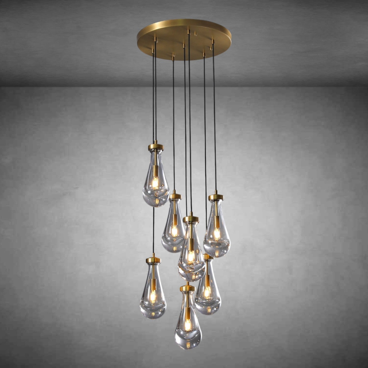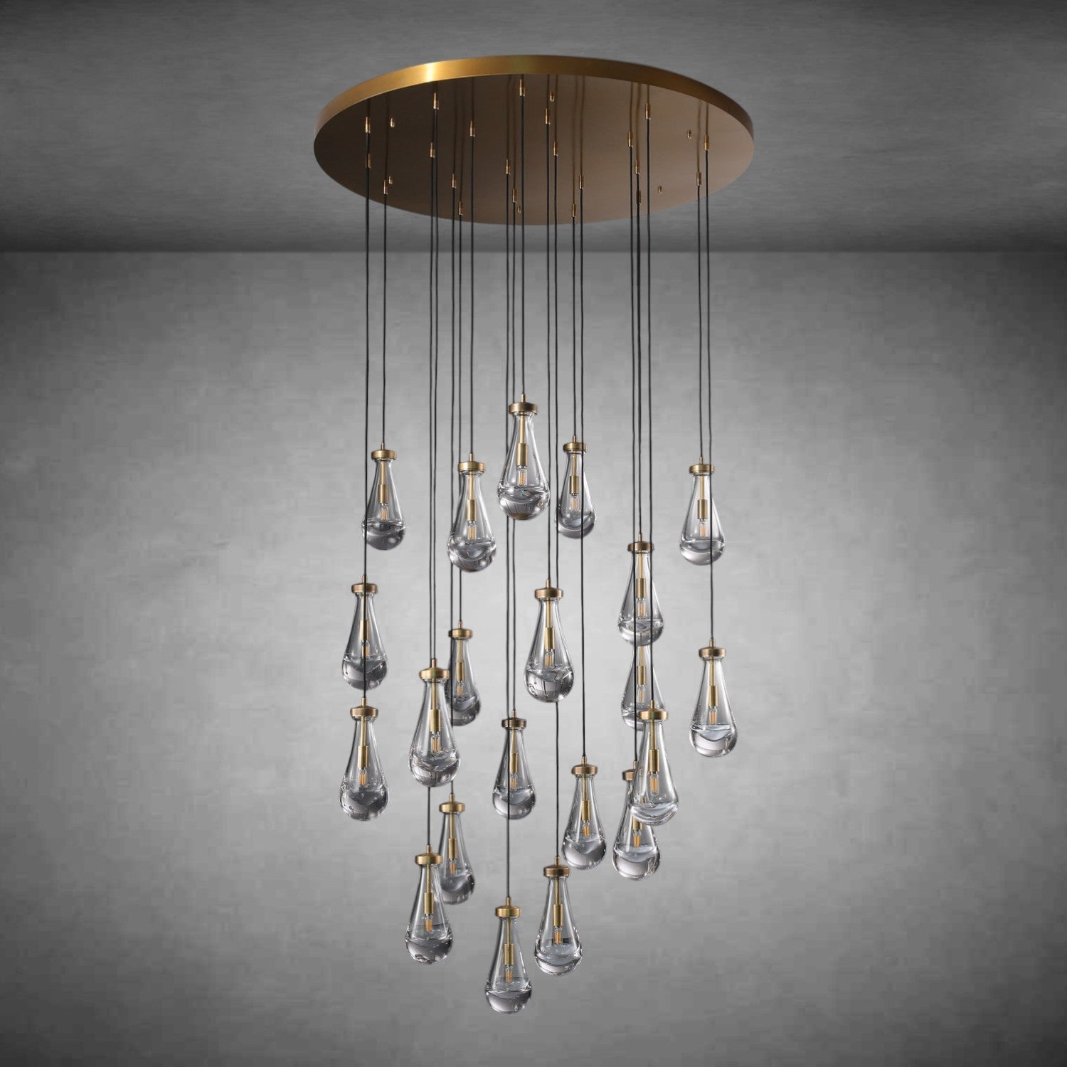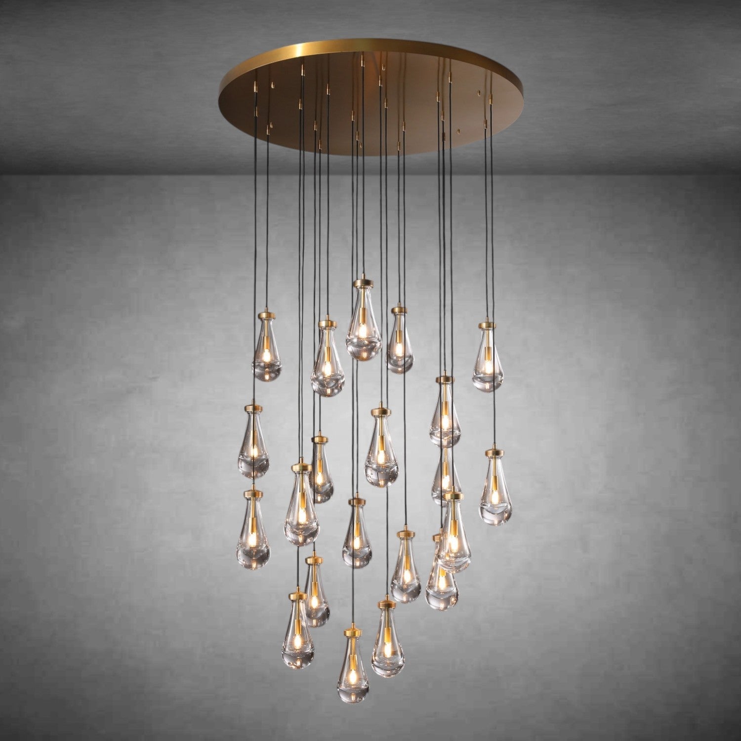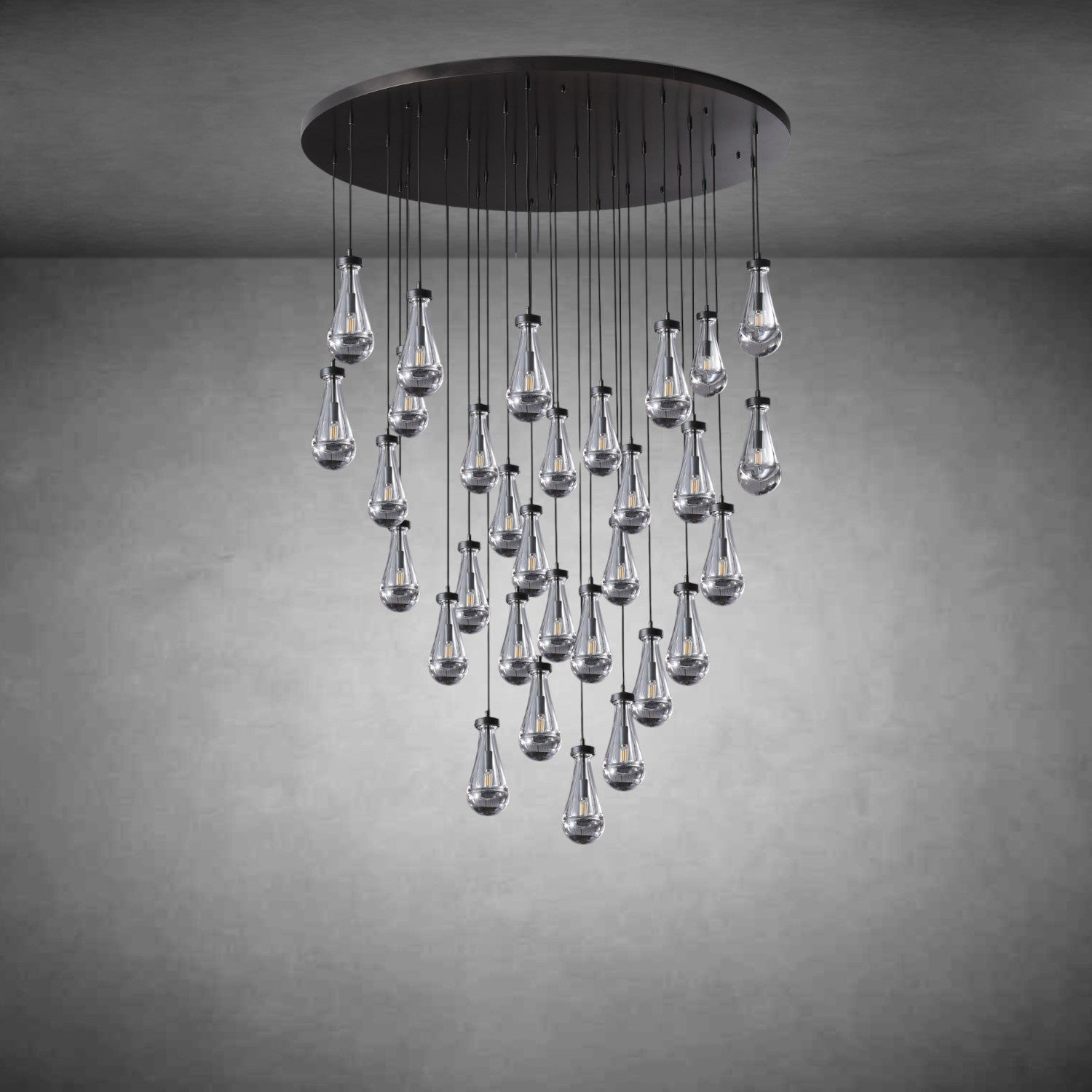 - Glass drops are suspended from black fabric cord; cord length may be altered at the time of professional installation
