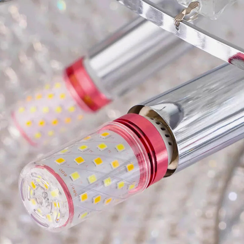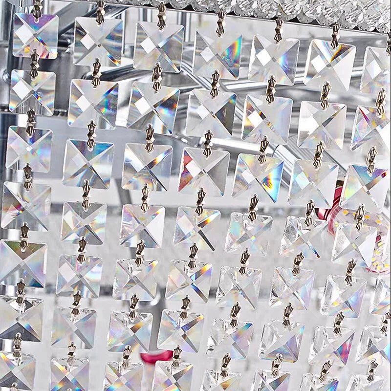 The chandelier features numerous square-shaped crystalprisms, these prisms are suspended by small, ornatemetal clasps or connectors, creating a shimmering andreflective display.lt is one of elegance and intricate detail,with the crystals catching and refracting light to produce adazzling effect.