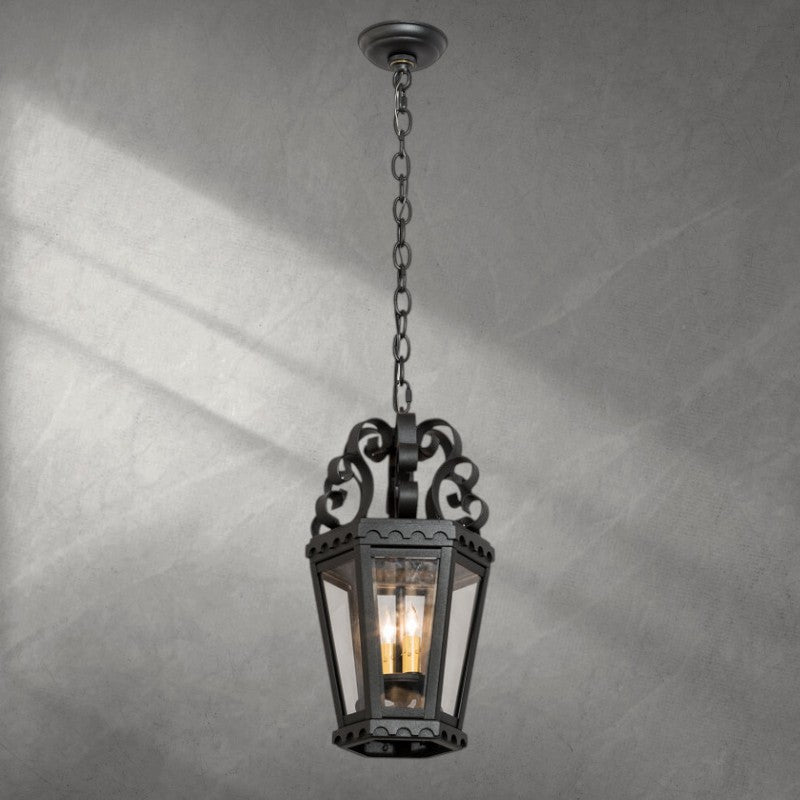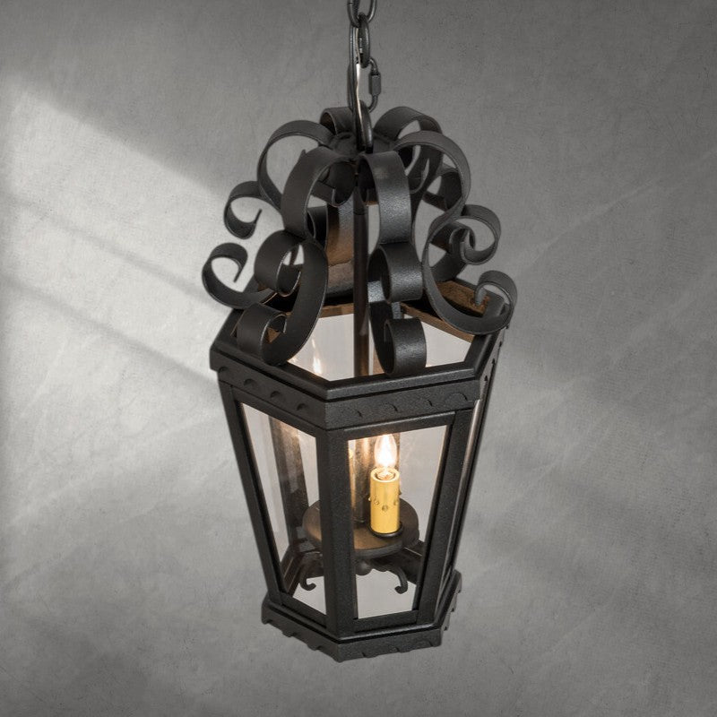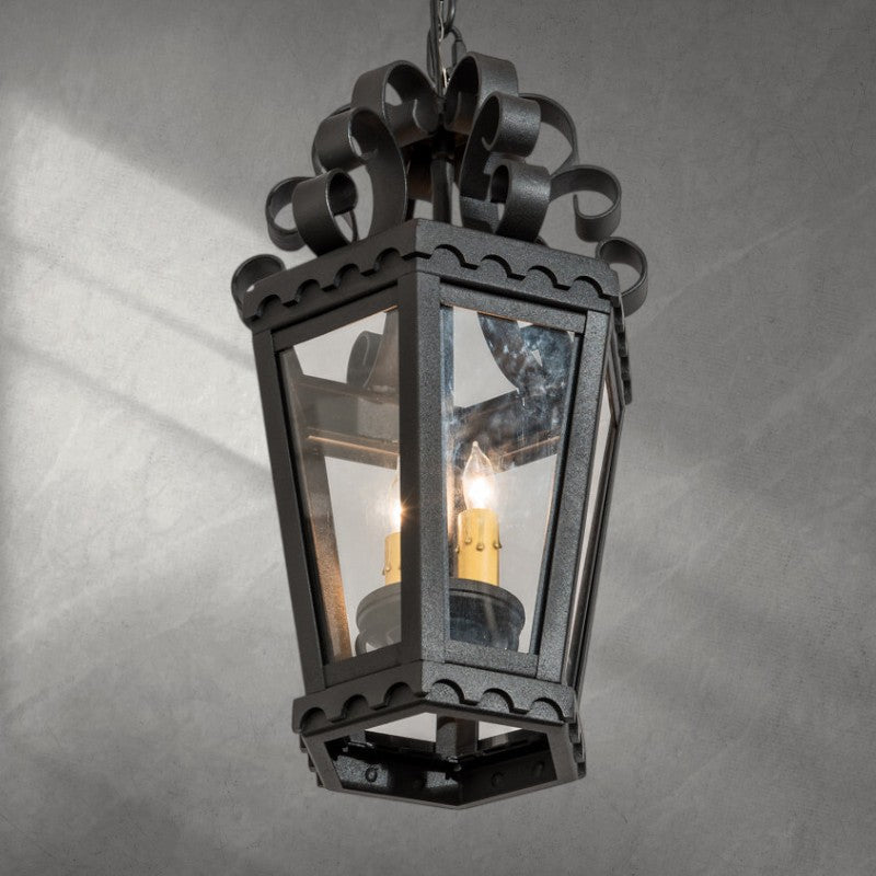The sophisticated upscale Cadenza lantern is designed with elaborate scroll details and brilliant elegance. Custom crafted of Hand-forged iron with a Black powder coat finish and complemented with 4 panels of Crystal Idalight that reveal 4 Amber faux candlelights which illuminate with Customer-supplied candelabra lamps. Designed with high-style appeal; the fixtures are used for beautiful ambient lighting in corridors; porches; entryways and other residential and commercial spaces. Handmade by highly skilled artisans in our 180;000 square foot manufacturing facility in Yorkville; New York. Available in special sizes; designs and finishes. UL and cUL listed for dry and damp locations.