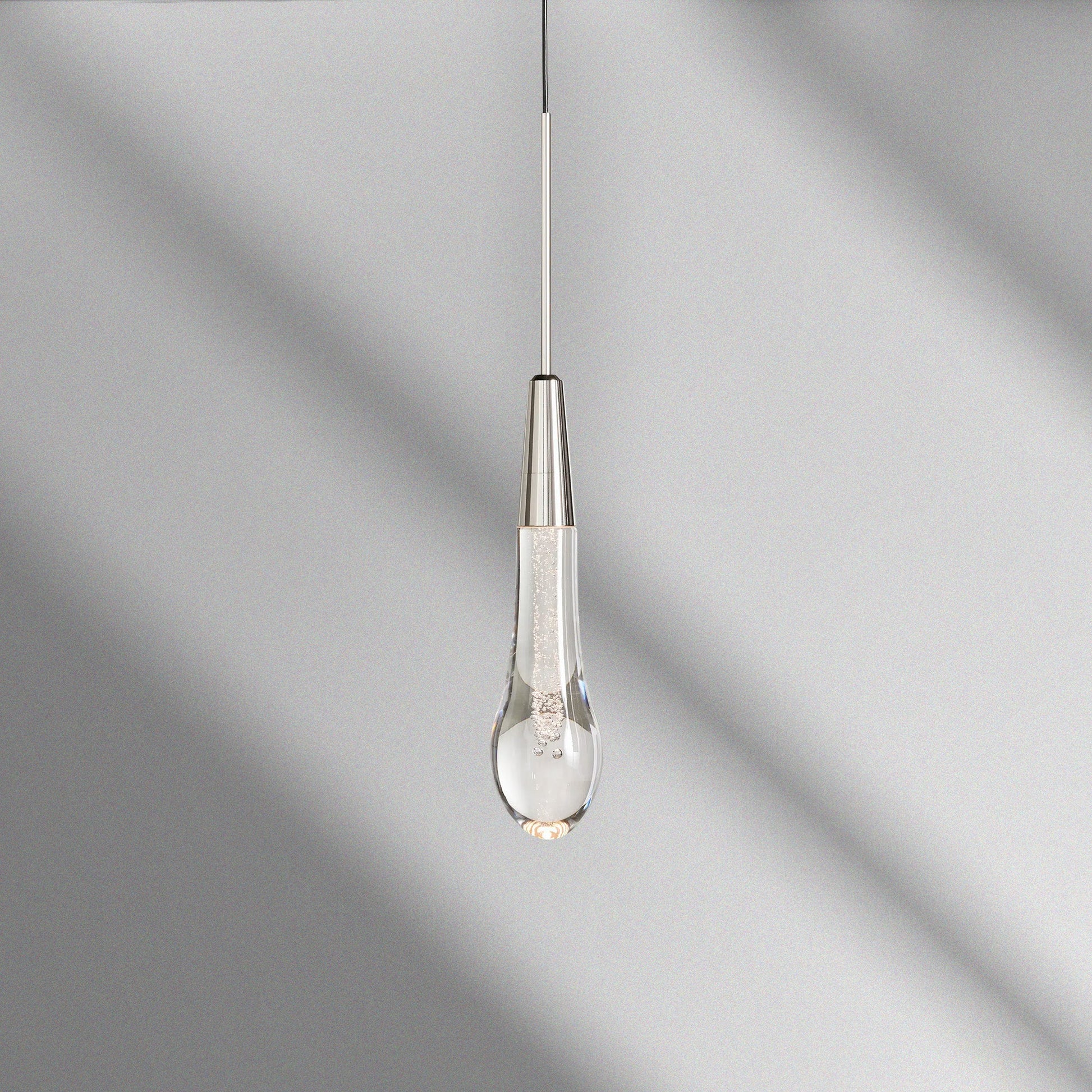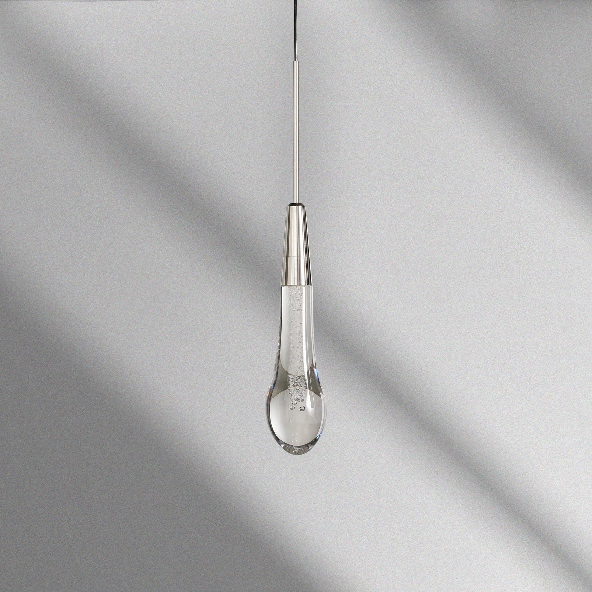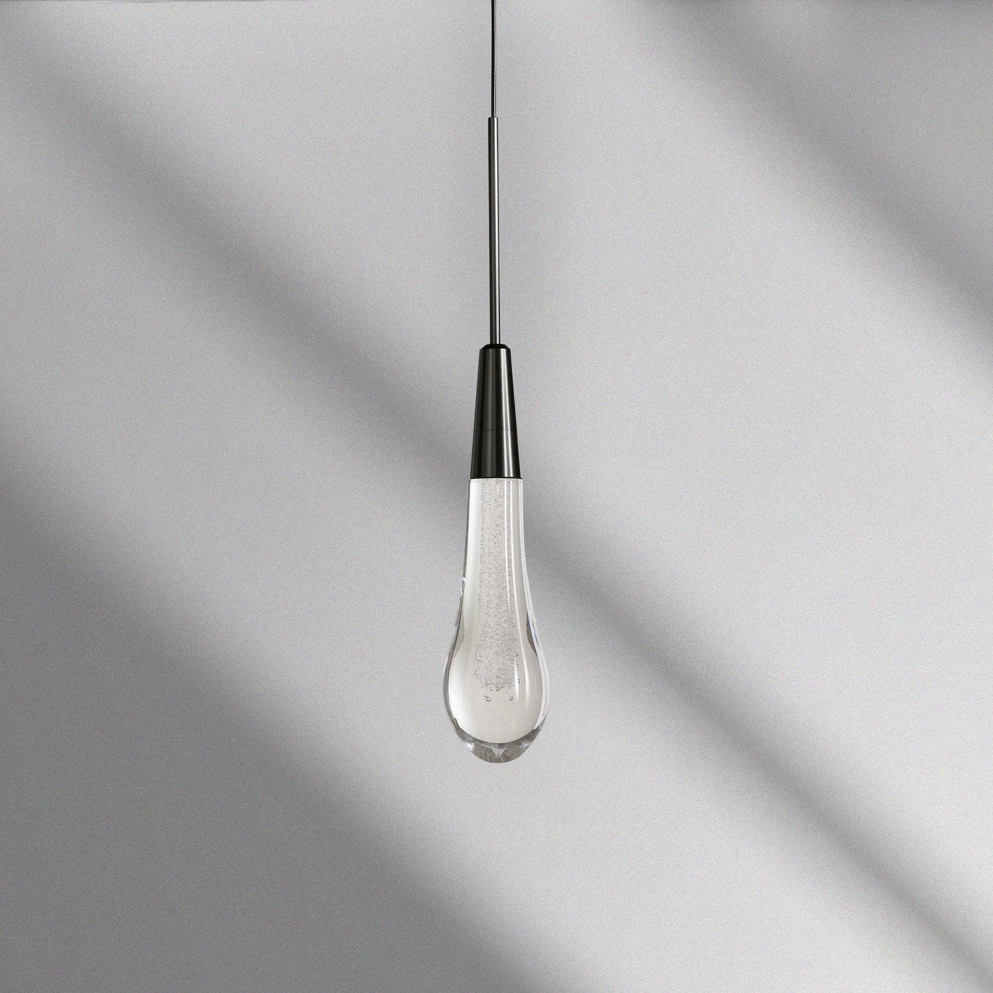 Featuring adjustable black PVC cords cascading into integrated LED lights handcrafted from seeded glass, our Soltaire Lighting Collection mimics the look of a fallen raindrop.