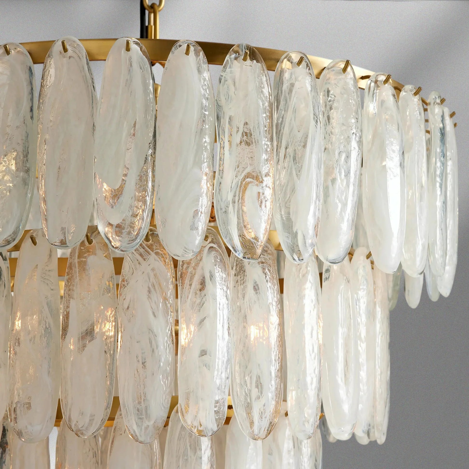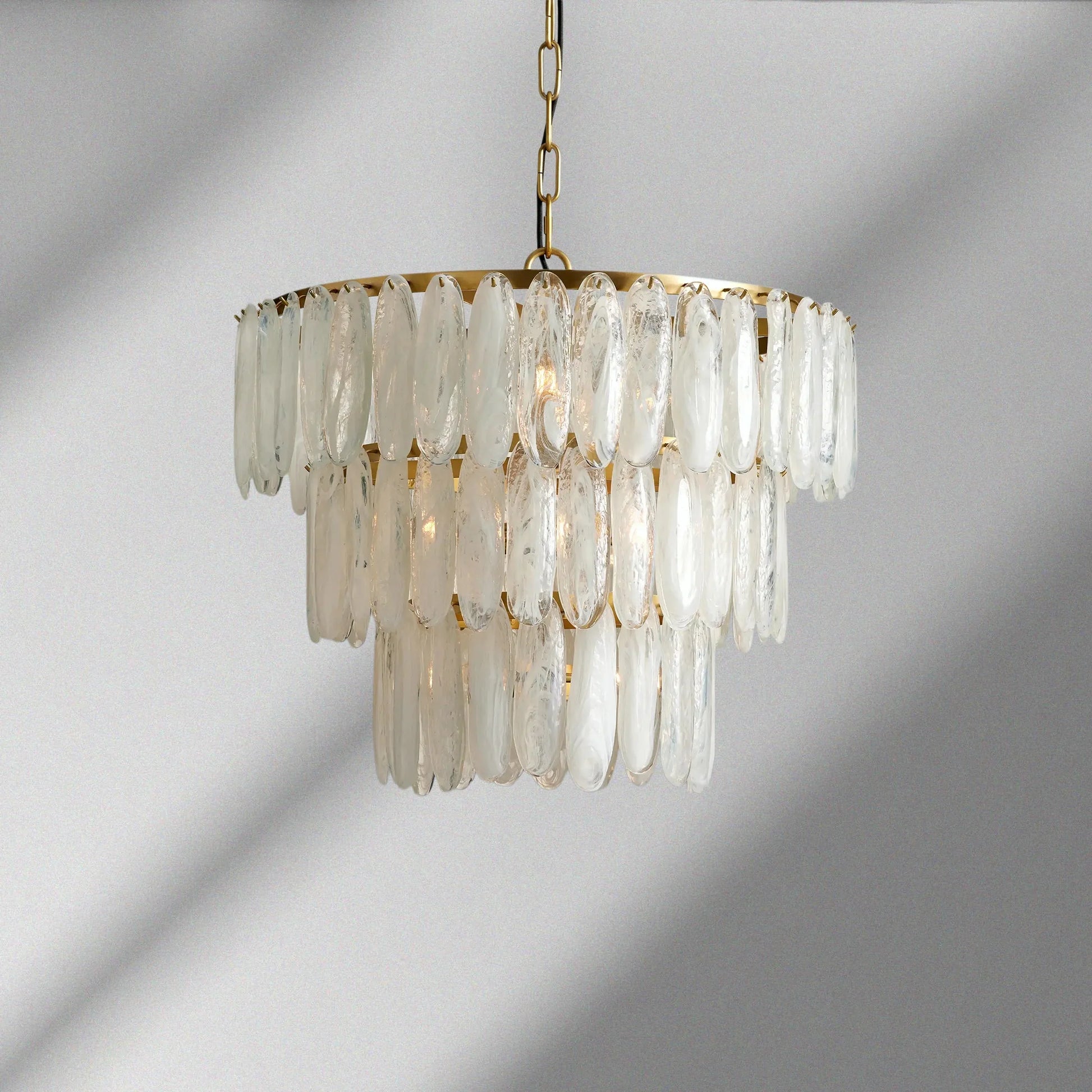Glowing and glamourous, our Verna Chandelier catches light with three tiers of individually handcrafted swirled glass pieces accented with a warm antiqued brass metal frame.